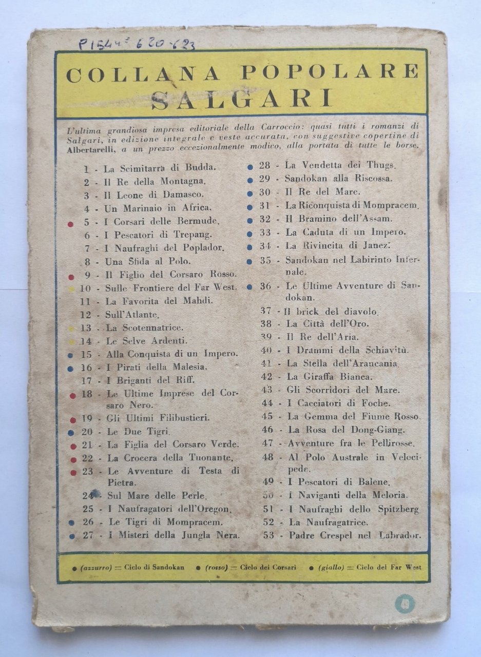 Editore Carroccio, 1947. Collana Popolare numero 49. 77 pagine, illustrazioni in bianco e nero fuori testo. Copertina editoriale in brossura. Stato di conservazione: buono (pagine ingiallite, copertina sciupata) Libro usato romanzo d'avventure salgariana sandokan