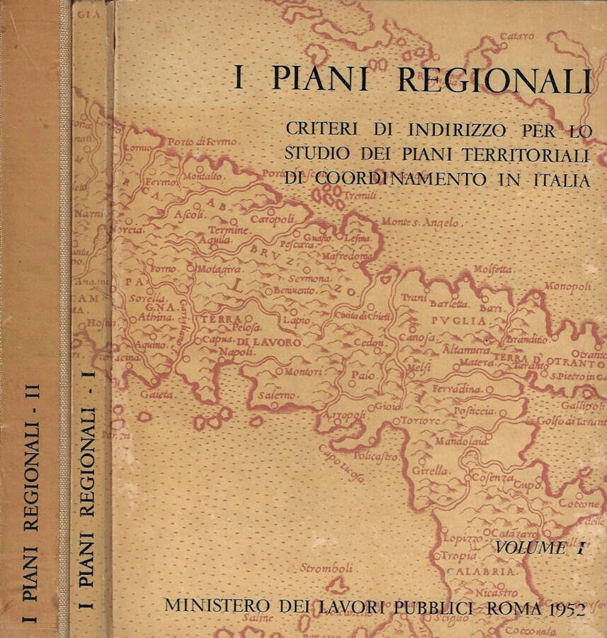 Opera completa in due tomi, parte seconda composta da due progetti distinti, fermati all'interno della stessa copertina, a destra rappresentazione grafica su schede rilegate con spirale in plastica, a sinistra il tomo due presenta la copertina con titoli montata al contrario. Legature vintage, copertine decorate, con tonalità ingiallite e appesantite, usurata da sfregamento e attrito, danni da piccoli urti e abrasioni alle estremità, interno illustrato da carte geografiche, numerose illustrazioni in rotocalco e schemi, fogli avvolti da ossidazione bruna, intensa ai margini, scuriti da denso pulviscolo i tagli. N. pag. 112; 126.