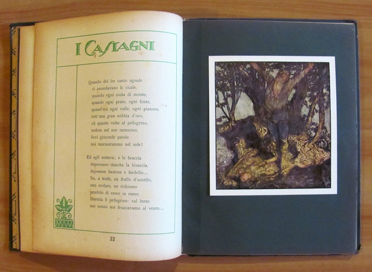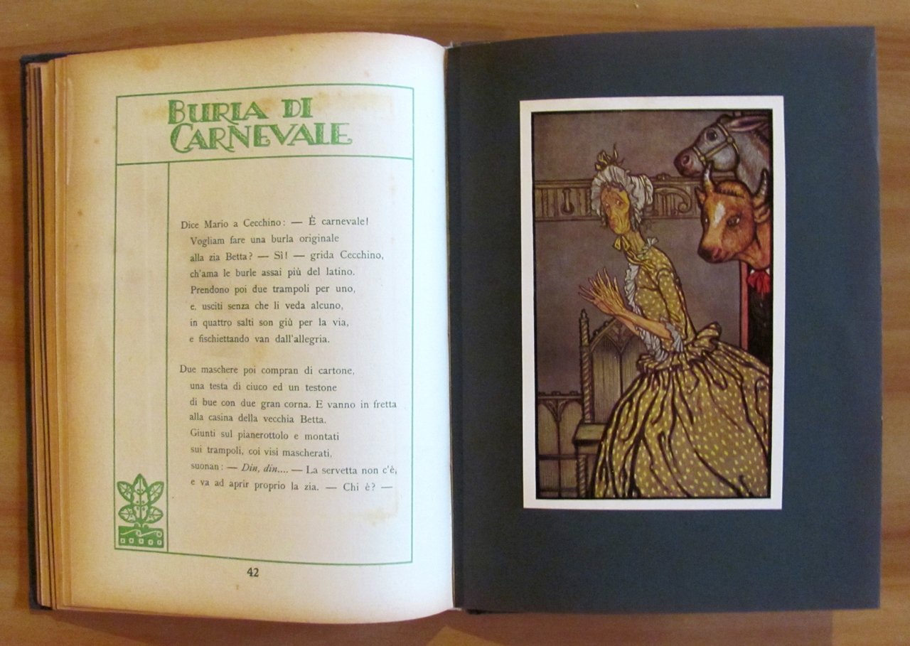 Splendida copertina in tricromia, frontespizio e fregi in cornice virati in verde e 9 tavole a colori applicate su cartoncino f.t. di Beppe Porcheddu. Ditta G. B. Paravia & C. - Torino, 1921. Cartonato editoriale con dorso in tela originale. Piccola spellatura dell'angolino basso esterno della copertina e rinforzi alle cerniere interne delle sole copertine. Sporadiche, lievi fioriture del tempo in poche pagine. 20,5x27,5; pp.61. Rarissimo e in Ottimo stato. , Molto buono (Very Good)
