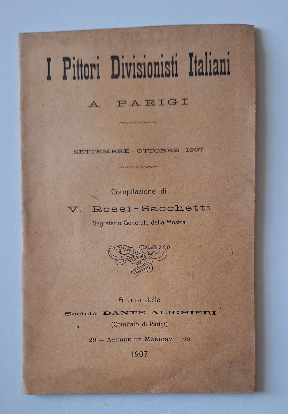 I PITTORI DIVISIONISTI ITALIANI A PARIGI SETT.-OTT. 1907 In 8°, copertina illustrata, pag. 29.Lievissimi segni alla copertina, Segno a matita al margine in 3 pagine.