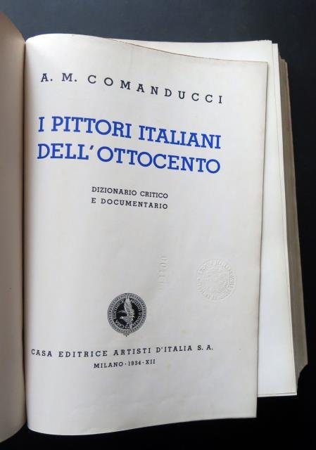 Milano, Casa Editrice artisti d’Italia S. A., 1934 - XII. In 4to, pp. 807 + pp. 28 n. n. (relative all' Elenco delle illustrazioni del testo e all’Elenco delle illustrazioni fuori testo), front. in blu e nero con timbro a secco della Società Italiana degli Autori ed Editori, mm. ill. fot. n. t. e f. t. in b/n, leg. orig. in mz. pelle con punte, piatti in cartonato rigido rivestiti in carta marrone, dorso a quattro nervi con titoli oro, fogli di guardia in carta marrone. Prima edizione di questo validissimo dizionario, punto di riferimento della pittura italiana fra la fine dell'Ottocento e la prima metà del Novecento; opera indispensabile per collezionisti e amatori d’arte, sono riportati i pittori italiani secondari, ciascuno con la propria scheda biografica corredata dalla riproduzione di almeno un dipinto. Legatura con difetti al dorso e piatti staccati, ottimo tutto l’interno. .