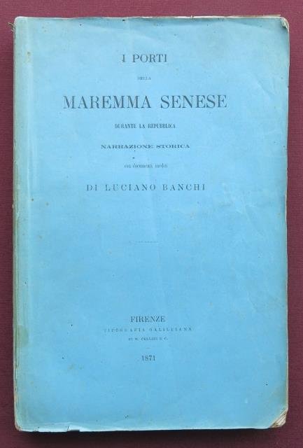 Tipografia Galileiana di M. Cellini e C., Firenze, 1871. Estratto dall'Archivio Storico italiano, Disp. del 1869 e 1870 (dal R. Archivio di Stato di Siena, come si legge nell'Avvertimento). In 8vo, pp. 193 (con Documenti, una Tavola Comparativa delle Gabelle del Porto di Talamone, ossia una tavola sinottica, e con l' Indice delle materie), bross. orig. in carta azzurrina. Le zona di interesse è l'Argentario con i porti di Talamone e Ansedonia, l'argomento i loro rapporti con gli altri porti della Toscana e le contese fra le autorità di dominio su questa porzione di terra toscana. Censito in poche biblioteche e raro a trovarsi in edizione originale. Corpo di testo aperto tra la pagina 80 e 81 (un unico filo tiene insieme il volume), mancanze della carta agli estremi del dorso, sciolto il quaderno 99 - 102, carta di copertina un po' gualcita, buono tutto l'interno. .