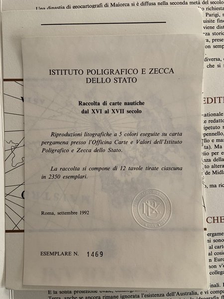 Cofanetto in folio in seta blu. contenente 12 tavole riproduzioni litografiche a 5 colori eseguite su carta pergamena presso l'Officina Carte e Valori dell'Istituto Poligrafico e Zecca dello Stato. Edizione limitata e numerata di 1999 esemplari, il nostro n.1469