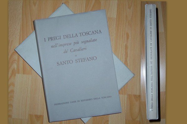 [Storia locale Toscana cavalieri](cm. 39) Brossura editoriale, con cofanetto in cartoncino. -pp. 18nn + 260 + xxiii. Copia anastatica del volume "I pregi della Toscana nell'imprese pi˘ segnalate de' cavalieri di Santo Stefano opera data in luce da Fulvio Fontana della Compagnia di Ges˘ dedicata all'altezza reale di Cosimo III Granduca di Toscana e Gran maestro dell'Ordine" Firenze : per P. M. Miccioni e M. Nestenus, 1701. Celebre opera del Fontana sulle imprese militari dei Cavalieri di Santo Stefano, resa pregevole dalle 37 belle incisioni calcografiche realizzate da Hendrick Verschuring che ripropongono i teatri di guerra delle pi˘ importanti battaglie navali combattute dalla flotta toscana contro i turchi, come quelle presso Algeri e Namur. Esemplare perfetto, solo usuali minime tracce del tempo al cofanetto esterno e lieve menda sul dorso. [n50]