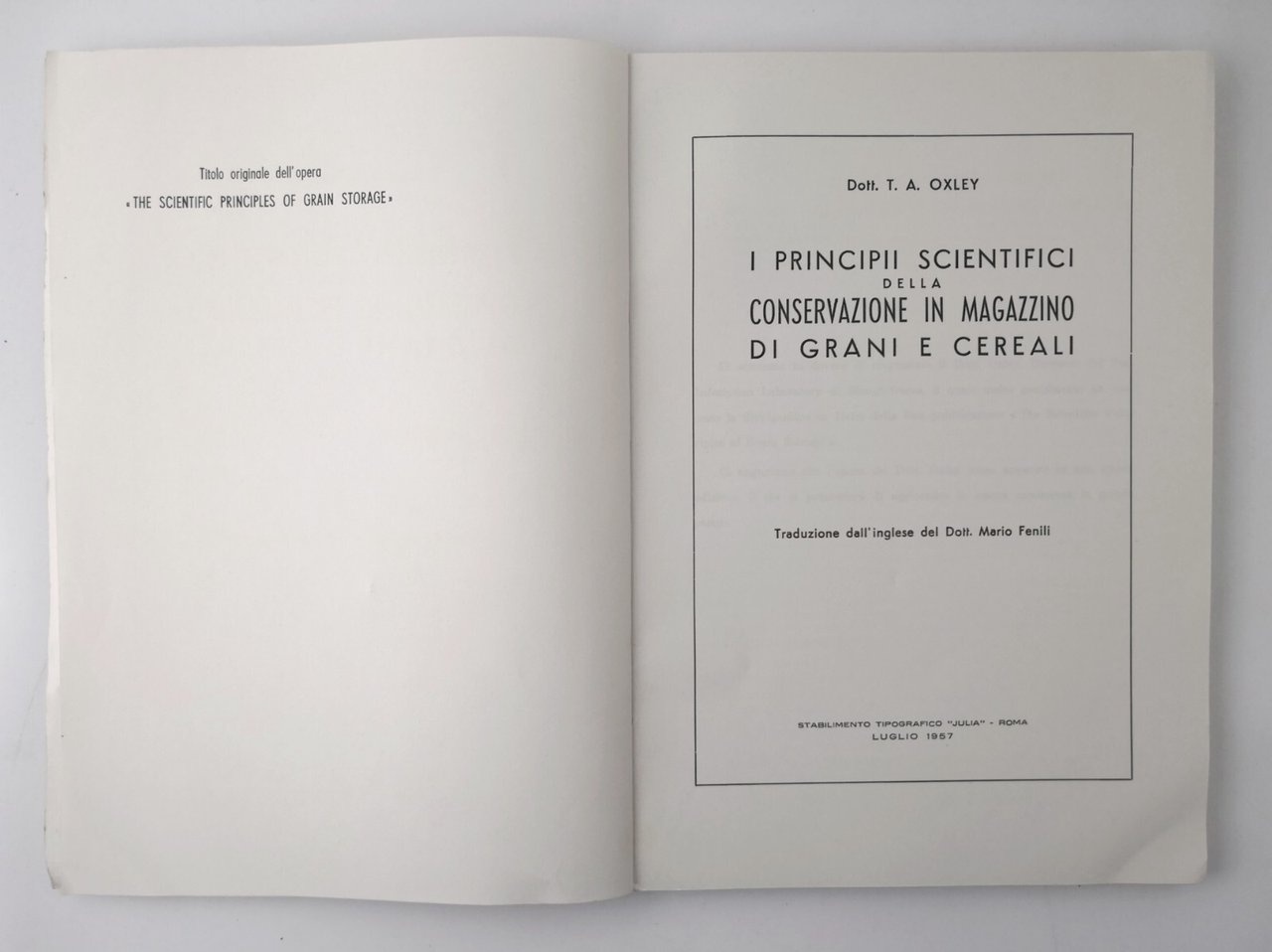 I PRINCIPII SCIENTIFICI DELLA CONSERVAZIONE IN MAGAZZINO DI GRANI E CEREALI 1957