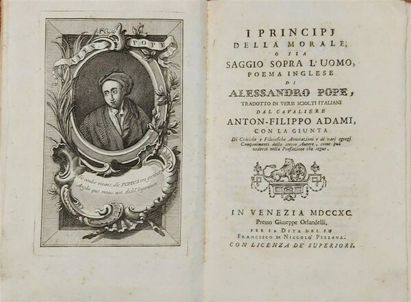 I PRINCIPJ DELLA MORALE o sia Saggio sopra l'Uomo. Poema inglese di. tradotto in versi sciolti italiani dal Cavaliere Anton-Filippo Adami, con la Giunta di Critiche e Filosofiche Annotazioni e di varj egregj Componimenti dello stesso Autore, come può vedersi nella Prefazione che segue.
