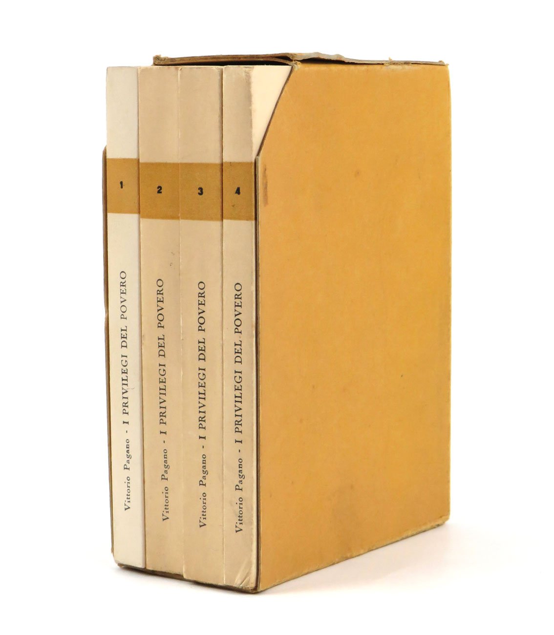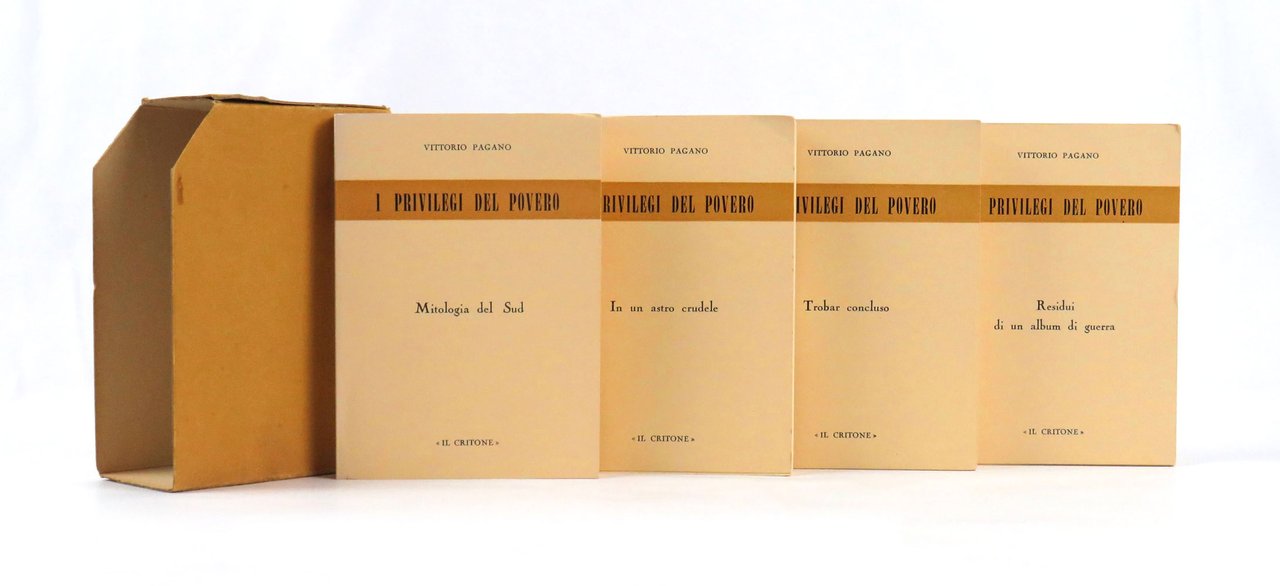 LIBROEdizione originale.Ottimo esemplare (minimi e normali segni del tempo), con il volume 1 n. 367 / 500, e i restanti volumi n. 378 / 500. Rarissimo, tanto più con il cofanetto editoriale conservato (lieve segno da urto all’angolo posteriore).Scarsamente conosciuto e capito, a lungo condannato alla marginalità all’interno del panorama del secondo Novecento letterario italiano, Vittorio Pagano è stato un poeta tenacemente fedele allo spirito ermetico in un tempo più facilmente segnato dall’adesione a diverse forme di neorealismo o dalla ricerca sperimentale “novissima” o neoavanguardista. Natio di Lecce, Pagano ha costruito la propria esistenza e il proprio immaginario poetico avendo come punti di riferimento e orizzonti ideali la terra d’origine e Parigi. Un’oscillazione testimoniata dall’impegno all’interno di esperienze e comunità intellettuali fortemente legate alla Puglia – a cominciare dalla partecipazione all’Accademia Salentina di Girolamo Comi e alla presenza all’interno della redazione della rivista a essa collegata, «L’Albero» - insieme a quella, non meno importante, di traduttore degli amati “poète maudit”, che Pagano avrebbe celebrato nella preziosa antologia da lui curata nel 1960 per le Edizioni dell’Albero. Schivo e disinteressato al riconoscimento ma ciononostante pubblicamente attivo, dal giugno del 1956 il poeta leccese diresse il supplemento letterario del periodico «Il Critone» dando vita, nel 1958, alla collana editoriale «I Quaderni del Critone» per cui uscirono, nell’arco di nove anni, diciotto volumetti tirati in poche centinaia di esemplari che ospitarono traduzioni o nuove versioni di poeti medievali francesi, raccolte d’ispirazione ermetica - come la silloge di Carlo Betocchi «Il vetturale di Cosenza» (1959) – e opere di narrativa tra cui si segnalano, per sottolineare la feconda relazione di Pagano con grandi autori a lui contemporanei, «Una città» (1958) di Romano Bilenchi, «Il caso e il caos» (1961) di Piero Bigongiari o ancora «Trame» (1963) di Mario Luzi. Ed è proprio all’altezza del periodo stretto tra il 1958 e la metà degli anni Sessanta che è possibile collocare anche la fase più intensa della sua produzione personale, a cui appartiene il rarissimo «Il privilegio del povero» qui presentato. Pubblicati nel 1960 per i tipi di «Il Critone» nel caratteristico formato in 24° con tiratura limitata a cinquecento esemplari numerati, nei quattro volumi che compongono l’opera trovano spazio le suite «Mitologia del Sud», «In un astro crudele», «Trobar concluso» e «Residui di un album di guerra», componendo un paesaggio che in tutto dichiara l’attaccamento di Pagano alla cifra ermetica e al Sud come luogo non soltanto geografico. Un legame, quest’ultimo, pagato con l’incomprensione se si presta fede a ciò che Oreste Macrì - grande tessitore del legame tra il Salento e Firenze, culla dell’ermetismo - affermò in «Nuova poesia del Salento europeo», saggio apparso nel 1980 sulle pagine del numero 63-64 di «L’Albero»: «Vittorio Pagano rimase [nella sua terra] e la pagò cara con l’ipertrofia barocco-simbolista, il maledettismo provincializzato, l’ermetismo negativo e misticheggiante, le velleità populiste, la morte disperata per nulla consolata dalla sicura gloria futura. Giacché con ogni difetto, o forse anche per esso, la poesia di Pagano sarà scoperta e resterà». Scritto un anno dopo la morte del poeta, queste parole tratteggiano tanto l’ostinata e peculiare chiusura di Pagano rispetto a qualsivoglia concessione al gusto o alle seduzioni del tempo quanto la futura riscoperta – anzi, “scoperta” – che pure gli sarebbe stata riservata. Una scommessa, quella di Macrì nel 1980, che infine si sarebbe rivelata almeno parzialmente vinta, grazie all’interesse che la poesia e l’attività intellettuale ed editoriale di Pagano hanno ricevuto negli ultimissimi anni, a partire dall’antologia «Poesie» pubblicata nel 2020 da Musicaos con la curatela di Simone Giorgino.