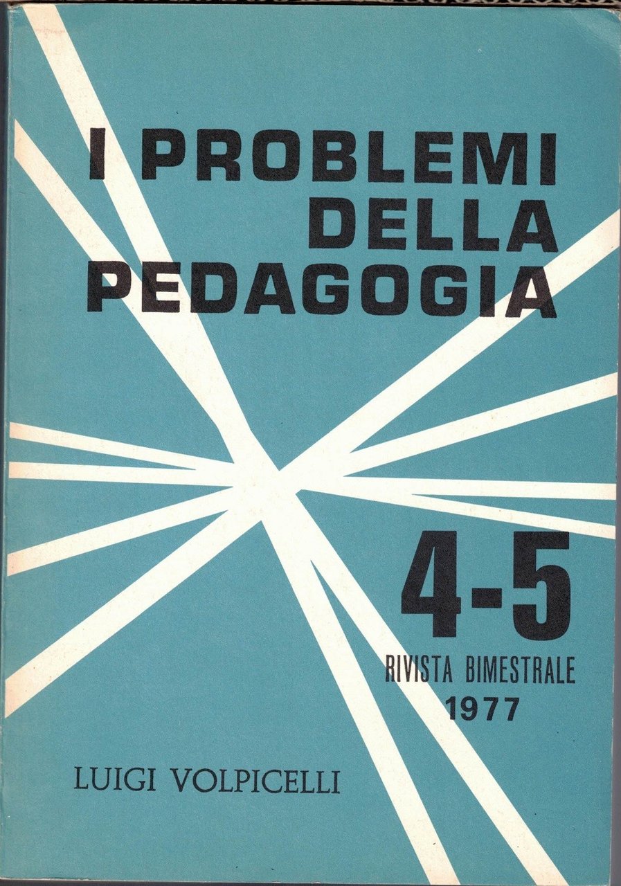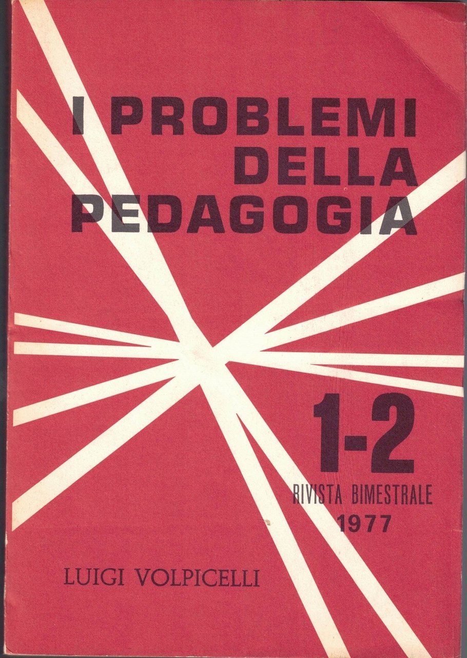 I problemi della pedagogia. Rivista bimestrale diretta da Luigi Volpicelli, s.n., Roma 1976-1978, 9 numeri (due doppi), pp. totali 1176, cm 21, br. ed. Il lotto comprende i seguenti 9 numeri della rivista I problemi della pedagogia. Rivista bimestrale diretta da Luigi Volpicelli: anno XXII, numero 5, settembre-ottobre 1976, pp. 741-940 – anno XXII, numero 6, novembre-dicembre 1976, pp. 941-1140 – anno XXIII, numeri 1-2, gennaio-aprile 1977 (numero doppio), pp. 284 – anno XXIII, numeri 4-5, luglio-ottobre 1977 (numero doppio), pp. 461-708 – anno XXIII, numero 6, novembre-dicembre 1977, pp. 709-884 – anno XXIV, numero 1, gennaio-febbraio 1978, pp. 176 – anno XXIV, numero 2, marzo-aprile 1978, pp. 177-352. Indici. A. XXII, n. 5, 1976: L. Volpicelli, I nodi al pettine – O. Panfili, Precisazioni sulla famiglia – P. Ciaravolo, Le dimensioni dell’uomo – F. Vitetti, Come promuovere nel preadolescente un atteggiamento mentale all’educazione permanente – S. Bucci, Le lezioni di filosofia morale date da Niccolò Tommaseo all’istituto Cavour di Torino nel 1854-55 – V. Vuri, Le società intermedie (II – M. Carbonara Naddei, Ottimismo e pessimismo: Leibniz e Leopardi – L. Bellatalla, È veramente amoudos la pedagogia di Dewey? – Recensioni – E. Zito, Marina militare – R. Zavalloni, R. Viana, Ricerca sul concetto di intelligenza sociale nei suoi riflessi educativi – P. Polesso, Il burattino nella scuola dell’obbligo di Bologna – G. Celata, Carlo Alberto autore per l’infanzia – S. Massoni, Riforma luterana e riforma della medicina – Schedario – Spogli di libri. A. XXII, n. 6, 1976: L. Volpicelli, Società e scuola, scienza e cultura nella Cina di Mao – Scuola a porte aperte – Young Jung, L’istruzione nella nuova China – Sin Sue-Wen, Una università agronomica di tipo nuovo – Università gestite dalle fabbriche – Il camino dei giovani istruiti – T. M. Mazzatosta, L’insegnamento artistico nella scuola italiana – L. Volpicelli, Il maestro come operatore culturale – V. Vuri, Le Civiltà intermedie. II. Civiltà ed educazione in Cina – A. Carpita, La filosofia dell’esperienza in J. Dewey – O. Panfili, Precisazioni sulla famiglia. I ruoli - M.–Barbieri, Dei diritti e dei delitti dei minori – Recensioni – A. Crimi, L’istruzione popolare in provincia di Catania nella prima metà del sec. XIX – E. Zito, L’istruzione professionale nell’esercito Guardia di Finanza – G. Inzerillo, La maestra Alda Costa vedetta sovversiva – F. Semi, Un bimillenario da celebrare. Vitruvio hm, – Spoglio di libri. A. XXIII, n. 1-2, 1977: G. Uscatescu, Scienza e tecnica nella convergenza del pensiero antico – U. Pirro, Dalla pedagogia come scienza filosofica alla pedagogia come scienza umana – H. A. Cavallera, Le prospettive pedagogiche nel pensiero di Spinoza- M. Ricciardi Ruocco, La pedagogia tra scienze umane e scienze biologiche – E. Lojacono, La riforma della scuola secondaria superiore e la concezione della filosofia nell’insegnamento medio della Repubblica Federale Tedesca – M. Signorelli, Teatro in Cina – D. Del Vecchio, Clima psicologico – O. Panfili, Precisazioni sulla famiglia. La famiglia e il ruolo della donna nel Mezzogiorno. I rapporti scuola-famiglia – V. Telmon, Apprendimento scolastico e scelte morali – G. Cives, Il ruolo dell’insegnante nel processo di comunicazione didattica e di ricerca socializzante – G. Mori, La tematica scolastica della sinistra prima e dopo la caduta della destra storica attorno al 1876 – Recensioni – G. Corradi Fiumara, Premesse per una psicologia dinamica dell’educazione – M. Carlotto Cavalcoli, Passato e presente nel documento di S. Girolamo sulla verginità – S. Vignoli, Il terapeuta della Gestalt e l’educazione – G. Cogni, Incontri indiani – G. Galeazzi, Saggio bibliografico sull’insegnamento secondario della filosofia in Italia – U. Pacilio, Del centenario di Marinetti di tante altre cose – Schedario – Spoglio di libri. A. XXIII, nn. 4-5, 1977: A. Negri, Scuola e lavoro, cultura e banausia – A. M. Jacobelli, I pregiudizi antikantiani dell’etica contemporanea – T. M. Mazzatosta, Aspetti di vita vissuta nella scuola fascista: le circolari ministeriali – D. Del Vecchio, L’impersonalità come malattia – R. Fornaca, La pedagogia e la scuola possono dire qualcosa sulla gestione della giustizia? – A. Pisanti, Disoccupazione intellettuale e politica scolastica – E. Mirri, Heidegger e la pedagogia – Recensioni – G. Cogni, Il fututo dell’uomo – U. Pacilio, Dei moscardini e di tante altre cose… - A. T. Polenghi Sannino, Aggiornamento sperimentazione e ricerca educativa e pedagogica – Schedario – Spoglio dei libri – Libri ricevuti. A. XXIII, n. 6, 1977: L. Volpicelli, La scuola privata e la libertà d’insegnamento – R. C. Lachal, Il contenuto morale e sociale del tema dell’infermo e degli altri diseredati nella letteratura edificante italiana per la gioventù nel secolo XIX – W. Böhm, Politica culturale e riforma scolastica nella Repubblica Federale di Germania – U. Pirro, Sulla politica scolastica del Governo – T. M. Mazzatosta, Sviluppi storici e pedagogici dell’Istruzione elementare in Italia dal 25 luglio 1943 al 1945 (I) – E. Fizzotti, Angoscia e personalità – A. Baldi, La Cassa del Mezzogiorno e le attività sociali (vicende degli anni ’60) – E. Pancera, L’azione pedagogica delle feste rivoluzionarie del 1798/99 (I) – Recensioni – E. Giambalvo, Il Convegno Nazionale di Filosofia su Etica e Politica – V. Recchia, Giullari a Viterbo – G. Cogni, L’eredità dell’India – Schedario – Spoglio di libri – Libri ricevuti. A. XXIV, n. 1, 1978: M. Fancelli, Problemi dell’apprendimento precoce – G. F. J. Cirigliano Lavoro e educazione – T. M. Mazzatosta, Sviluppi storici e pedagogici dell’Istruzione elementare in Italia dal 25 luglio 1943 al 1945 (II) – Recensioni – R. Massa, La r
