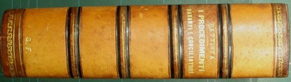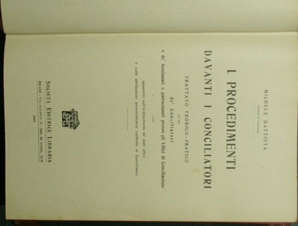 Trattato teorico pratico ad uso de' conciliatori e de' funzionari e patrocinanti presso gli Uffici di Conciliazione - Con appendici sull'ordinamento de' detti uffici e sulle attribuzioni amministrative conferite ai conciliatori - in 8° - pp.XVI + 1024 - Mezza pelle con titolo e fregi in oro al dorso nervato - Tagli rossi