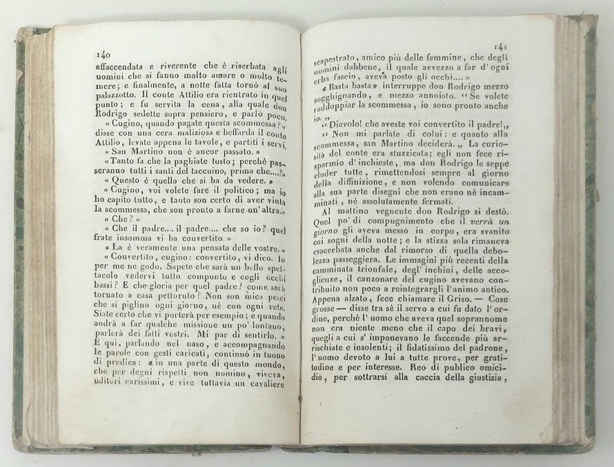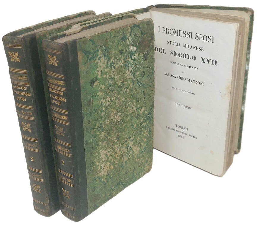 >3 volumi in-16 (mm. 151x100), pp. XV, 268; 292; 330. Legatura coeva in m. pelle , titolo oro, fregi e filetti oro al dorso a nervi. Terza edizione torinese, in piccolo formato, del celebre romanzo manzoniano. Buon esemplare. Parenti n. 42. Vismara 6. Manzoniana Hi n. 27.