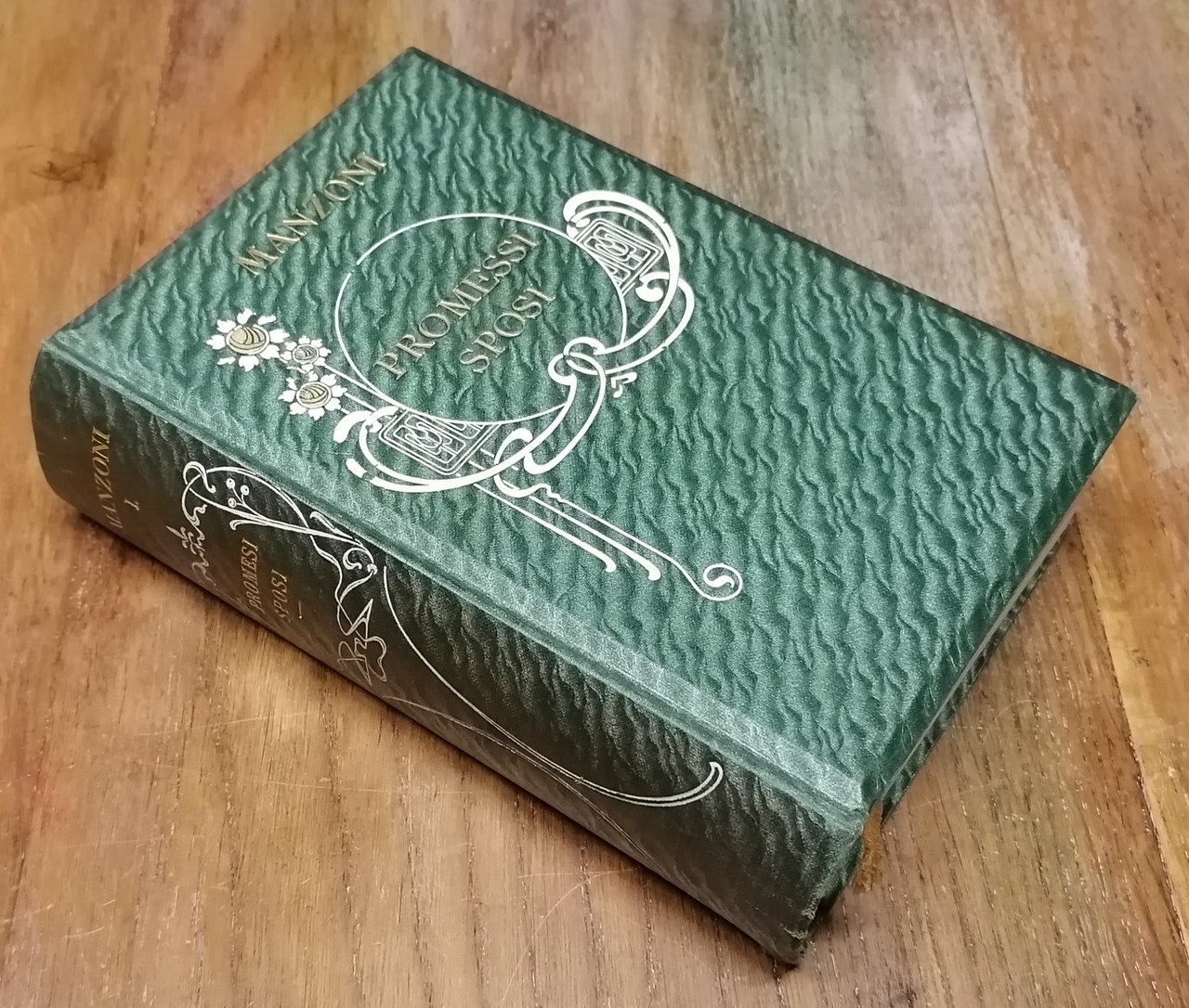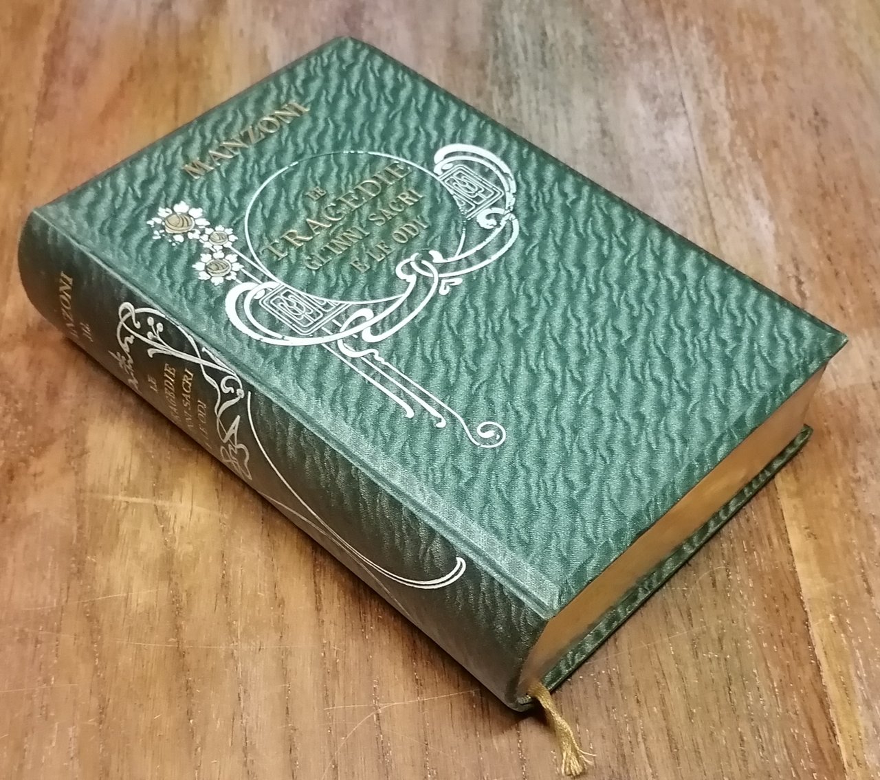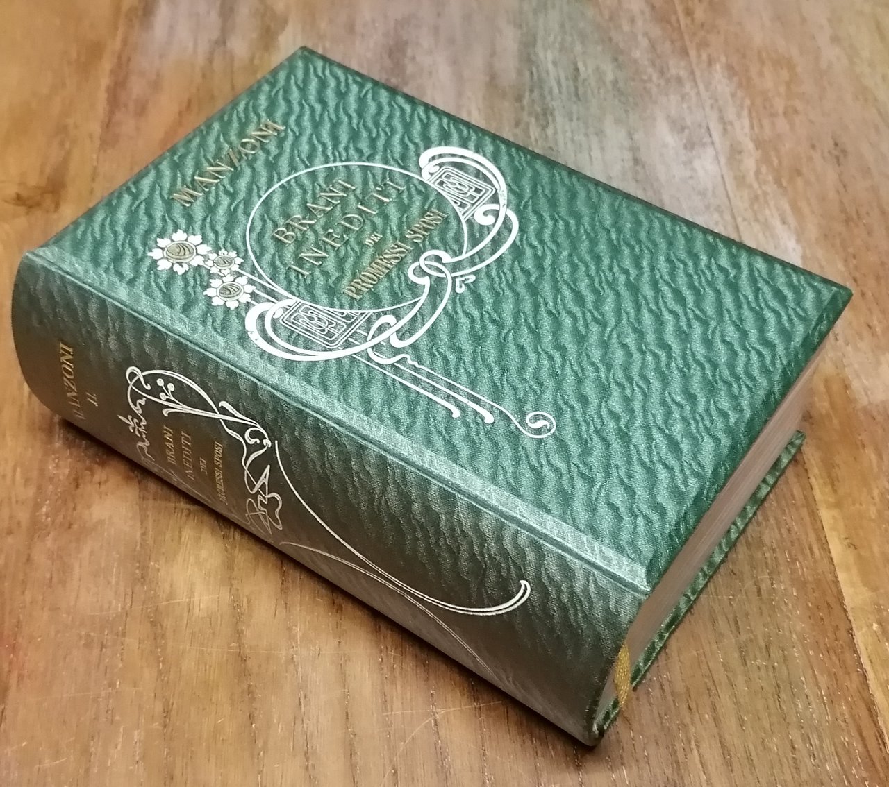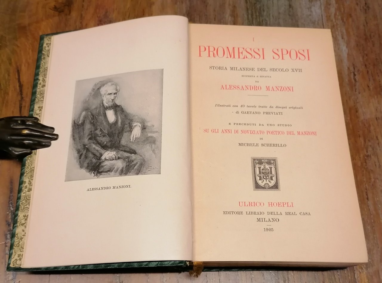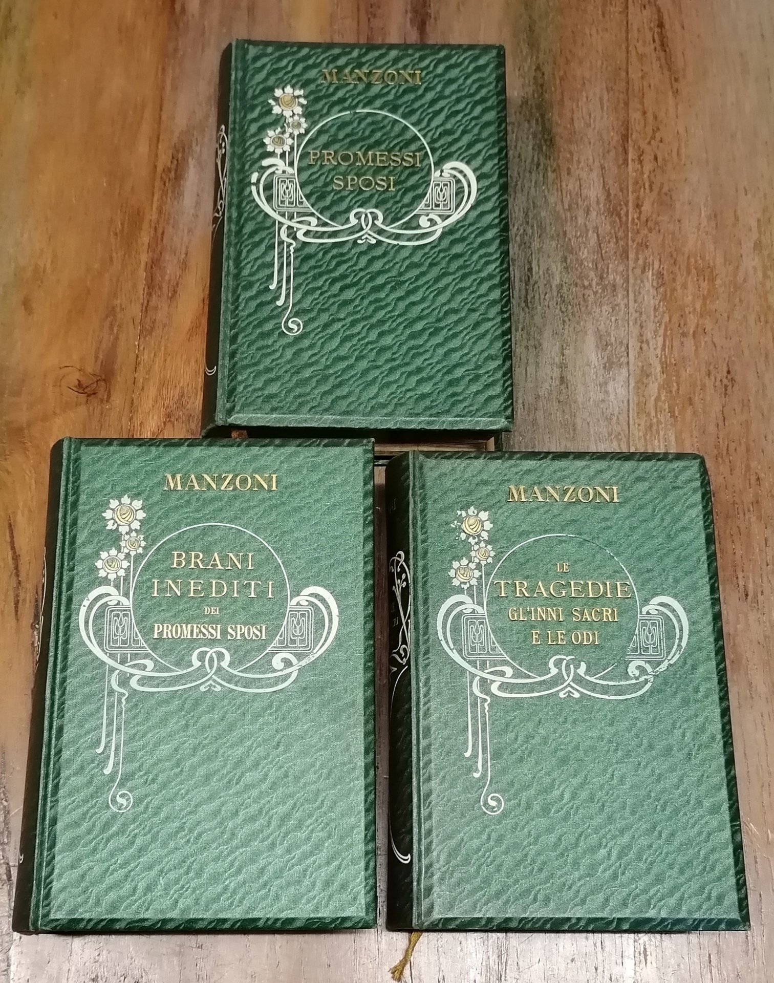 Tre volumi in 16° grande (cm 18 x 12,5), bella legatura editoriale in piena tela con titoli ed ornato in stile floreale impressi in bianco ed oro al dorso ed al piatto anteriore, tagli dorati, guardie in carta decorata, segnalibro in seta. Volume primo : I Promessi sposi. Storia milanese del secolo XVII scoperta e rifatta da Alessandro Manzoni. Illustrati da 40 tavole tratte da disegni originali di Gaetano Previati e preceduti da uno studio su "Gli anni di noviziato poetico del Manzoni" di Michele Scherillo, 1905, pp. LIII,(3),574,(2), con un ritratto del Manzoni in antiporta e tavole fuori testo. Volume secondo : Brani inediti dei Promessi Sposi di Alessandro Manzoni per cura di Giovanni Sforza, 1905, seconda edizione accresciuta, due parti in volume unico, pp. CXX,352 ; CXXIV,353-772,(2). Volume terzo : Le tragedie, gli inni sacri e le odi di Alessandro Manzoni nella forma definitiva e negli abbozzi, con le varianti delle diverse edizioni e con gli scritti illustrativi dell'autore, a cura di Michele Scherillo. Precede uno studio "Sul decennio dell'operosità poetica del Manzoni", 1907, pp. CLXXIV,(2),540, con un ritratto giovanile del Manzoni in antiporta. Ottimo stato di conservazione.
