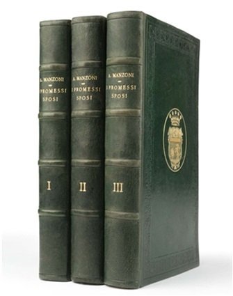 In-16 gr. (mm. 188 x 120), 3 volumi, pregevole legatura in marocchino verde alle armi, piatti con cornici decorate a secco, dorso a cordoni con titoli in oro, tagli dorati, risguardi decorati, pp. (4),352; (4),368; (4),416,(2). Esemplare completo degli occhietti e dell'errata. "Edizione originale" del più celebrato romanzo della lingua italiana; tiratura insolita e probabilmente intermedia con varianti della prima tiratura e varianti della seconda.Il primo volume, come usualmente, non presenta varianti o modifiche tipografiche apportate in fase di stampa. Nel volume secondo, a differenza della quasi totalità degli esemplari, la spaziatura incongrua nelle lettere della parola rispetto (p. 22, r. 28) è qui corretta e la riga intera ristampata correttamente; invece l'errore tipografico a p. 183, con caduta del 3, è presente. Nel terzo volume è presente l'errore di stampa a inizio del rigo (p. 298, r. 13) con la virgoletta chiusa, invece che aperta e anche la caduta della l in al-|tro a fine rigo (p. 412, r. 1). E' presente la variante con la prima lezione gioia carnale (p. 330, r. 14) poi autocensurata dal Manzoni nel più innocuo gioia mondana. Harris e Sartorelli, sulla base di alcuni elementi materiali, ipotizzano che il primo stato recasse la lezione carnale, poi sostituito in corso di stampa con mondana; tra gli esemplari censiti dai due studiosi, quelli che recano la lezione censurata sarebbero meno numerosi. Invece, è presente la variante con la lezione corretta di questa storia senza la caduta della preposizione di' nella frase in più d'un luogo di questa storia (p. 378, r. 13): errore segnalato anche nell'errata, che ne indica la presenza in alcuni esemplari.Cfr. Vismara,1: E' questa l'edizione Principe; essa è ricercata dagli amatori perché rara, e dai critici vien pure ricercata pei così detti lombardismi che vi si contengono - Parenti Bibl. Manzoniana, 35-36 - Parenti Rarità,I,198 - Fumagalli,531 - Salveraglio, 21 - Govi Classici,295 - Harris-Sartorelli La Ventisettana dei Promessi sposi: collazione e cancellantia, in «Annali manzoniani,I, 2016. Occasionali fioriture e macchioline, una leggera gora a poche carte del secondo volume, una piccola menda riparata a p. 131 del primo volume, ma certamente un buon esemplare. Insieme ai tre volumi del Manzoni, è offerto il fascicolo del Corriere delle Dame dell'8 Settembre 1827 nel quale si annuncia l'uscita del romanzo.