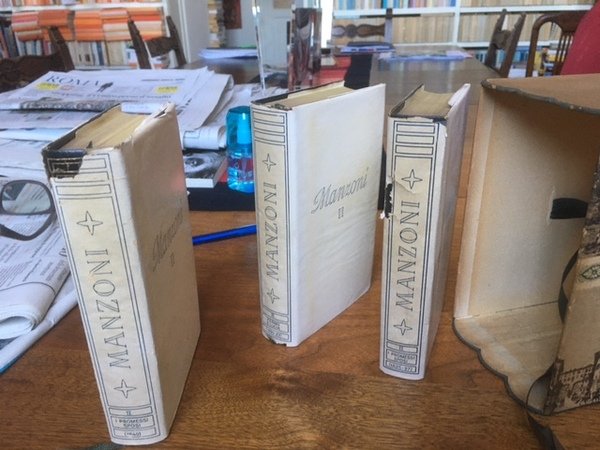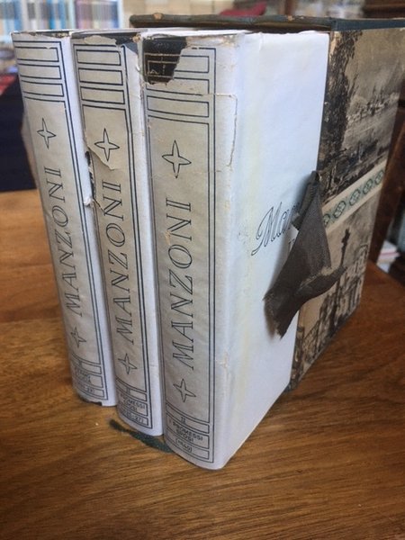 3 volumi In-16,pp.992+1036+892.Carta India. Leg. t.pelle edit. con fregi in oro e sovracoperte (queste ultime SCIUPATE, e fragili strappi e riparazioni, in cofanetto interi in ottimo stato. Classici mondadori. tutte e tre le edizioni dei Promessi sposi, in cofanetto. raro. completo. Three volumes with the three original editions of the Bethroted, full leather with djs (jackets worn, teared and tape repaired, books in good condition) in case. scarce in such complete.