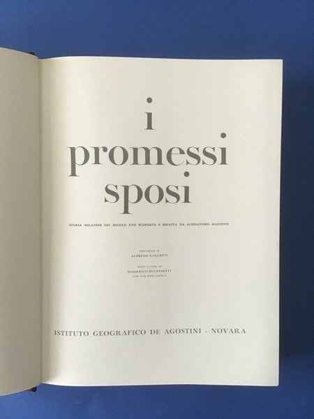 Storia milanese del secolo XVII scoperta e rifatta da Alessandro Manzoni. Prefazione di Alfredo Galletti. Testo a cura di Domenico Bulferetti con una nota critica. Il testo è interpretato da 150 illustrazioni e quadri di Gustavino. Il testo è nuovo con una menda al dorso della sovracoperta in acetato