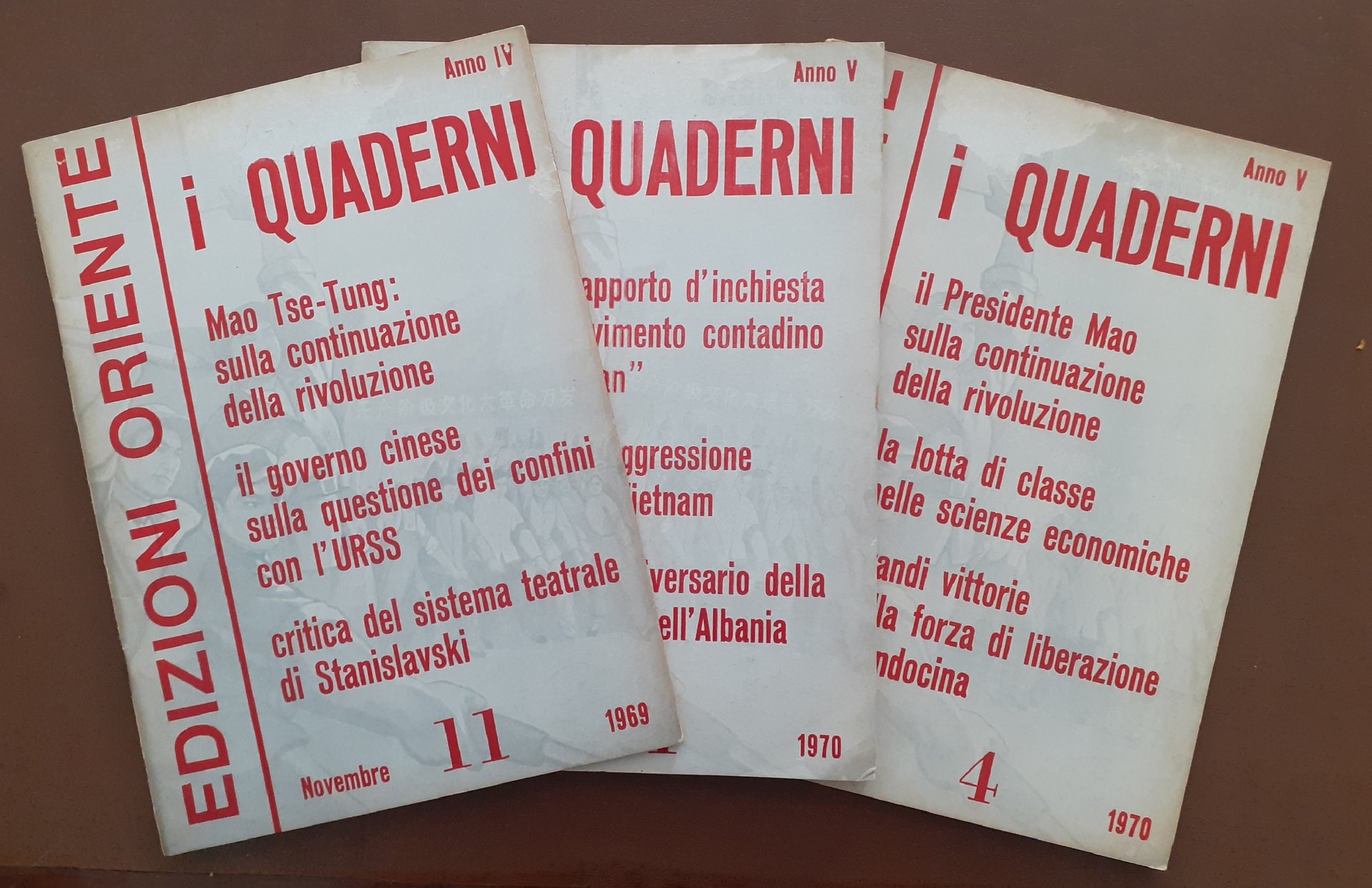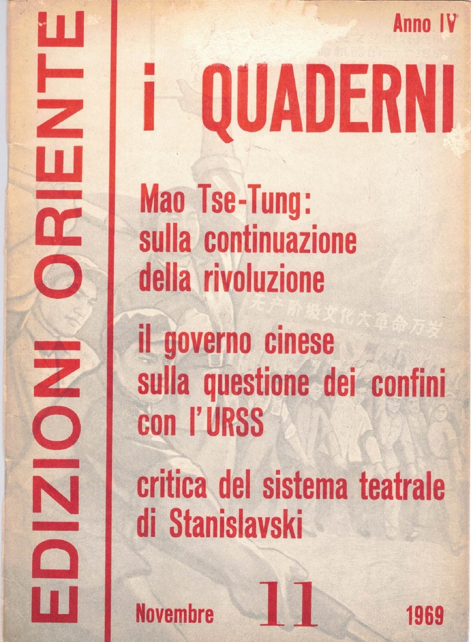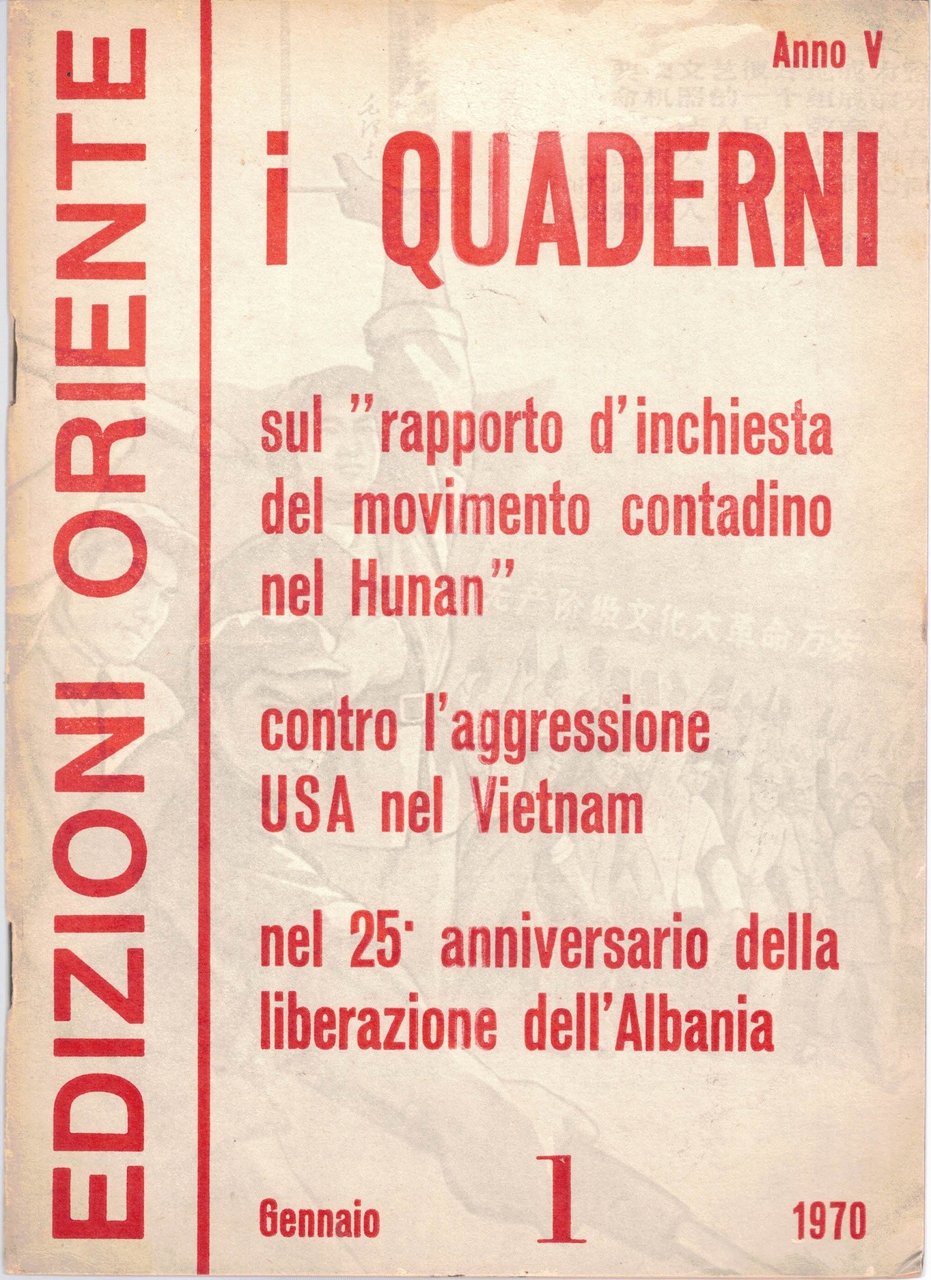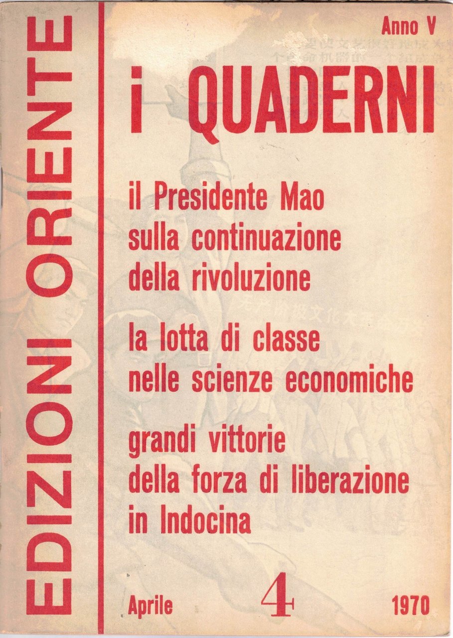 i Quaderni. Rivista mensile, direttore responsabile Giuseppe Regis, Edizioni Oriente, Milano 1969-1970, 3 numeri non consecutivi, pp. totali 280, cm 23, fascicoli rilegati a punto metallico. Il lotto comprende i seguenti 3 numeri della rivista Quaderni. Rivista mensile, direttore responsabile Giuseppe Regis: anno IV, n. 11, novembre 1969 (pp. 88) – anno V, numero 1, gennaio 1970 (pp. 96) – anno V, numero 4, aprile 1970 (pp. 94). Indici. A. IV, n. 11, novembre 1969: Il presidente Mao Tse-tung sulla continuazione della rivoluzione sotto la dittatura del proletariato – Documento del Ministero degli esteri della Repubblica popolare cinese – Il nostro paese ha proceduto con successo all’esplosione di una nuova bomba a idrogeno e al suo primo esperimento nucleare sotterraneo – Esperienze di lotta-critica-trasformazione (A proposito del sistema Stanislavski – Utilizzare la dialettica materialista per guarire le malattie correnti) – La costruzione del socialismo in Cina (La Comune Popolare Pioniera della Cina avanza sulla via socialista – Una fabbrica di macchine agricole al servizio dell’agricoltura – Enorme sviluppo dell’industria tessile della Cina – Proposta lanciata dal complesso siderurgico della capitale per una emulazione rivoluzionaria – In Cina la costruzione meccanica entra in una nuova fase di sviluppo – Rapido sviluppo dell’industria cinese del petrolio alla luce del principio del presidente Mao indipendenza e autonomia, contare sulle proprie forze – La Cina sviluppa la produzione degli insetticidi, del cloro e della soda caustica – Ribasso generale e sostanziale dei prezzi dei medicinali in Cina) – Guerre di popolo e lotte rivoluzionarie (Sviluppo della lotta rivoluzionaria di massa in Europa occidentale nel nord America e in Oceania – Sviluppo della lotta dei soldati americani contro la guerra di aggressione e le persecuzioni fasciste – I contadini brasiliani prendono coscienza della loro spaventosa miseria) – La crisi dell’imperialismo e del revisionismo (Il fantasma di Dulles non può salvare la cricca dei rinnegati revisionisti sovietici – L’espansione e il saccheggio economico dell’imperialismo americano nei paesi del Sud-Est asiatico – Aggravamento delle difficoltà finanziarie ed economiche nei paesi imperialisti occidentali – Una riedizione della teoria dell’ultra-imperialismo – I diagrammi di organizzazione del lavoro, sistema revisionista sovietico di sfruttamento degli operai – Chi è Wang Ming?). A. V, n. 1, gennaio 1970: Per lo studio del Rapporto di inchiesta sul movimento contadino nel Hunan – Esperienze di lotta-critica-trasformazione (Rafforziamo l’edificazione della milizia popolare – La partecipazione die quadri al lavoro produttivo – Commento al film Lenin in Ottobre e Lenin nel 1918 I giornali murali di Shanghai La formazione di capitani-marinai Critica del romanzo Mattino a Shanghai) – La costruzione del socialismo in Cina (Portiamo avanti la meccanizzazione sulla base della cooperazione – Raggiungere nuove vette nella scienza e nella tecnica – Raccolto abbondante quest’anno in Cina Una nuova forza tecnica specializzata nei lavori idraulici La lotta per la costruzione della ferrovia Tanzania-Zambia) – Guerre di popolo e lotte rivoluzionarie (I popoli dei paesi imperialisti contro l’aggressione Usa nel Vietnam – I contadini francesi contro lo sfruttamento e l’oppressione La lotta armata popolare del Dhofar – Il popolo giapponese contro la visita di Stato negli Usa – Successi delle forze armate popolari del Kalimantan settentrionale) – Movimento comunista internazionale (Messaggio di felicitazioni dei dirigenti cinesi a quelli albanesi – Popolo eroico e brillante vittoria – Il movimento di rivoluzionarizzazione in Albania si approfondisce – Amicizia nella lotta tra popolo cinese e popolo del Vietnam Felicitazioni al popolo sovietico nel cinquantaduesimo anniversario della Rivoluzione di ottobre) – La crisi dell’imperialismo e del revisionismo (L’imperialismo Usa è sempre più isolato nel manipolare le Nazioni Unite per opporsi alla Cina – Aggravarsi della crisi del regime fascista di Franco – Difficoltà dell’imperialismo americano – Il governo libico si libera delle basi militari e delle banche straniere – Complotto criminale dei reazionari americani e giapponesi L’Indonesia messa all’incanto La nuova politica di Nixon in America Latina). A. V, n. 4, aprile 1970: I popoli arabi salutano calorosamente il messaggio di Chou En-lai – Rifiuto coreano di partecipare alle ricerche oceanografiche con l’Urss Ministri e funzionari libici ricevono il corrispondente dell’Agenzia Hsinhua – Lotta-critica-trasformazione (La teoria del presidente Mao sulla continuazione della rivoluzione – I comitati rivoluzionari vanno avanti Critica del film Visita a un parente) – La costruzione del socialismo in Cina (La lotta delle classi nelle scienze economiche – Gli incentivi materiali, reazione contro la dittatura del proletariato La classe operaia cinese mira in alto Nuova materia prima tessile) – Guerre di popolo e lotte rivoluzionarie (Messaggio di Lin Piao alle forze armate di liberazione del Sud Vietnam – Dichiarazione del Fronte patriottico del Laos sulla riconquista della Piana delle Giare – Sosteniamo fortemente la guerra del popolo laotiano Il movimento di liberazione nazionale in Africa si sviluppa Studenti tunisini manifestano contro Rogers Tempesta anti-Usa nelle Filippine Grandi vittorie dell’Esercito popolare di liberazione della Colombia Gli indiani americani insorgono Lotta degli studenti in Gran Bretagna) – Movimento comunista internazionale (Il compagno Hoxha sulla rivoluzionarizzazione della scuola – Il PC brasiliano chiama alla lotta contro la dittatura fascista I rivoluzionari iraniani sotto la bandiera del pensiero di Mao Tse-tung) – Crisi dell’imperialismo e del revisionismo (La nuova strategia per la pace di Nixon 