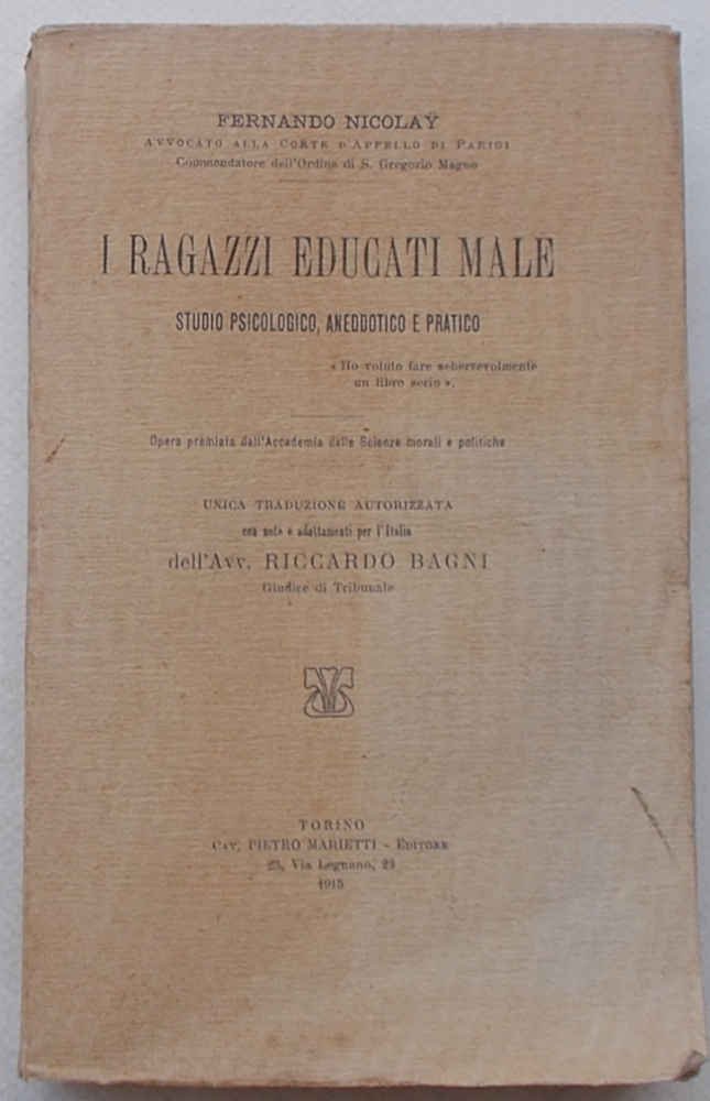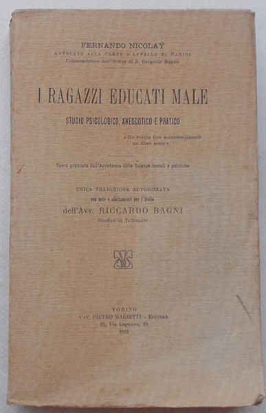 In 16° grande (cm. 19 x 12); pagg. XII, 474; leggera cartonatura originale VG-. ** Prima edizione italiana. Contiene: ritratto di ragazzi educati male; diversi metodi di educazione domestica; l'autorità e la correzione; la fisionomia e il carattere; influenza della gaiezza sull'educazione; idee dei fanciulli rispetto alla felicità; percezione, facoltà e sentimenti del bambino; l'educazione nella culla; l'amore paterno - l'amore filiale; la denigrazione - la maldicenza; le cause ereditarie; bambini "prodigiosi" e "frutti appassiti" - il lavoro eccessivo; esame di alcuni sistemi; l'educazione dei genitori "di fronte ai figli".