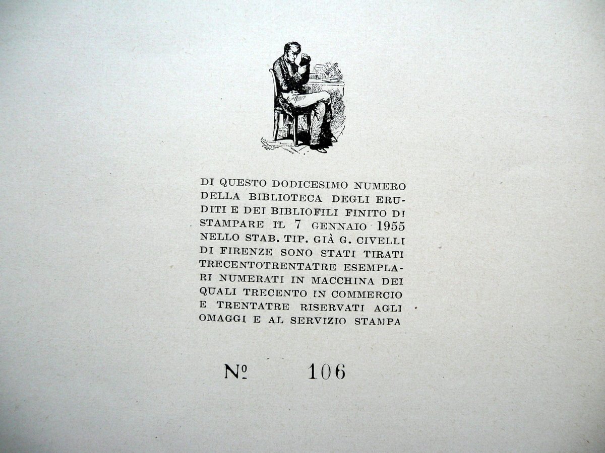 Traiano Boccalini, I Ragguagli del Parnaso" Bibliografia delle edizioni italiane Sansoni antiquariato, Firenze 1955; cm 25,5x18; pp. 38 di testo pi√π 28 facsimili di frontespizi in b/n fuori t. (qualcuno con numerazione doppia). Brossura ed. Frontespizio con timbretto - ex libris del precedente proprietario. Condizioni di conservazione Esemplare ben conservato con tracce d'uso, margine sup. della brossura ant. con un minimo strappetto restaurato al retro con nastro adesivo. Interni buoni. Esemplare edito in tiratura limitata di 333 esemplari numerati; n/s 106 (vedi foto colophon). SETT136.L13365 N "