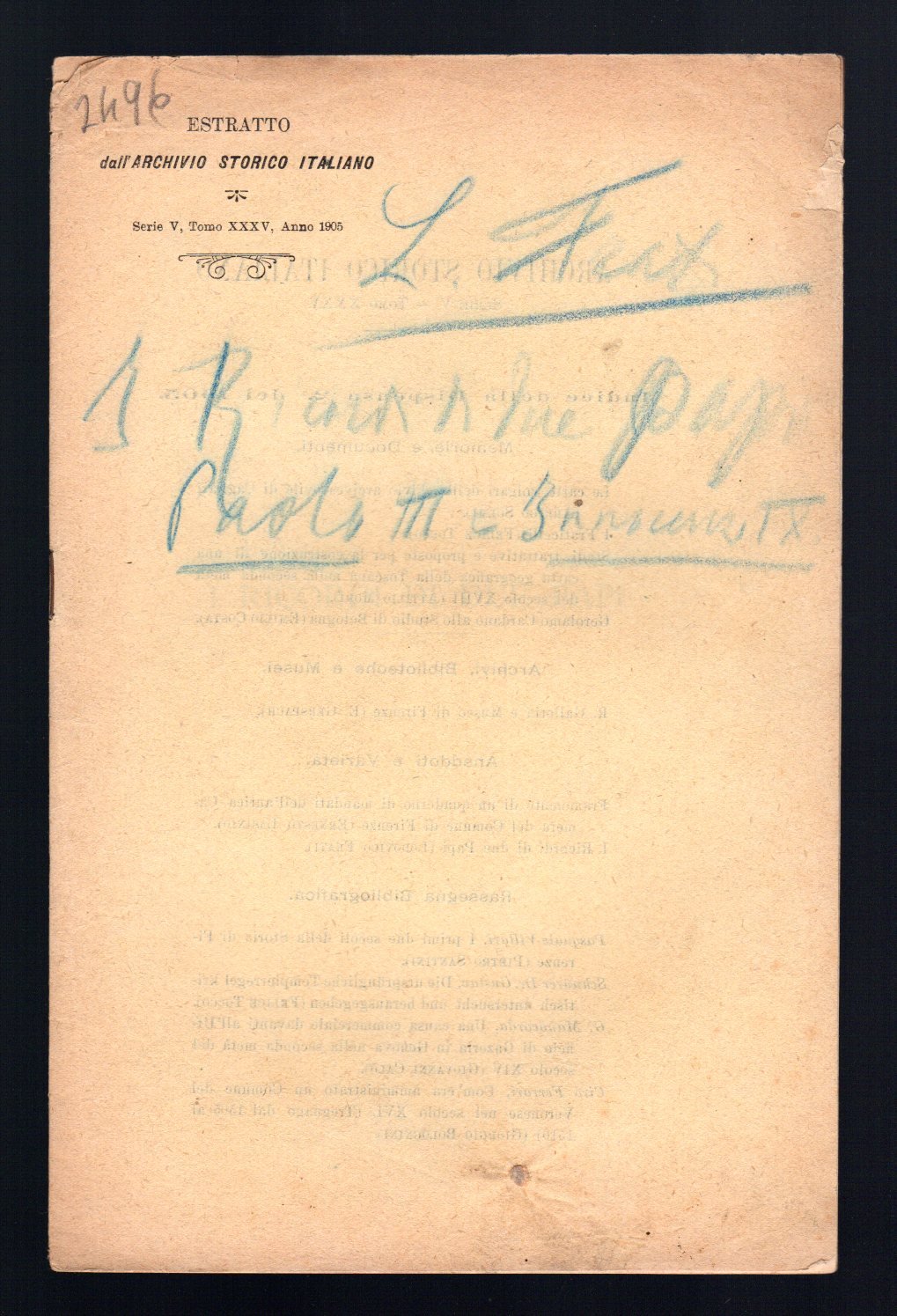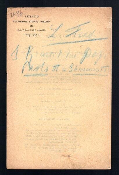 Opuscolo vintage. Estratto dall'Archivio Storico Italiano - Serie 5° - Tomo. XXXV - Anno. 1905. Strappetto in copertina, segni di matita e matita colorata in copertina. Usura da scaffale. Ordinario segno del tempo.