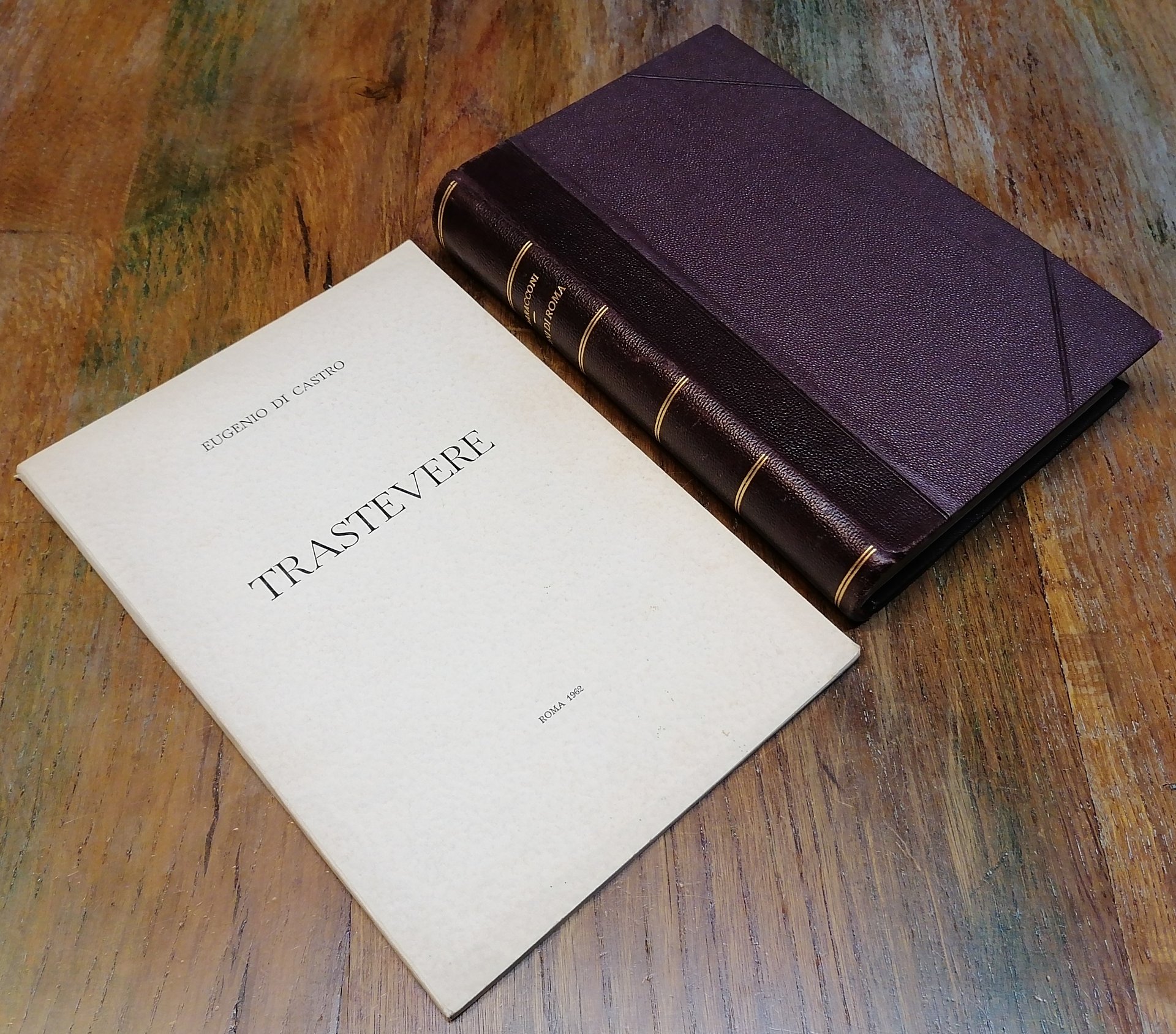 In 8°, legatura coeva in mezza pelle color vinaccia, titolo e filetti impressi in oro al dorso, piatti in percallina con filetti a secco, pp. (4),606, con numerose illustrazioni nel testo tra cui le fototipie degli acquerelli della "Roma pittoresca" di Ettore Roesler Franz. Aggiungiamo il libretto : "Trastevere" di Eugenio di Castro, Roma, Nuova Tecnica Grafica, 1962, pp. 82, con illustrazioni nel testo. Ottimo stato di conservazione.