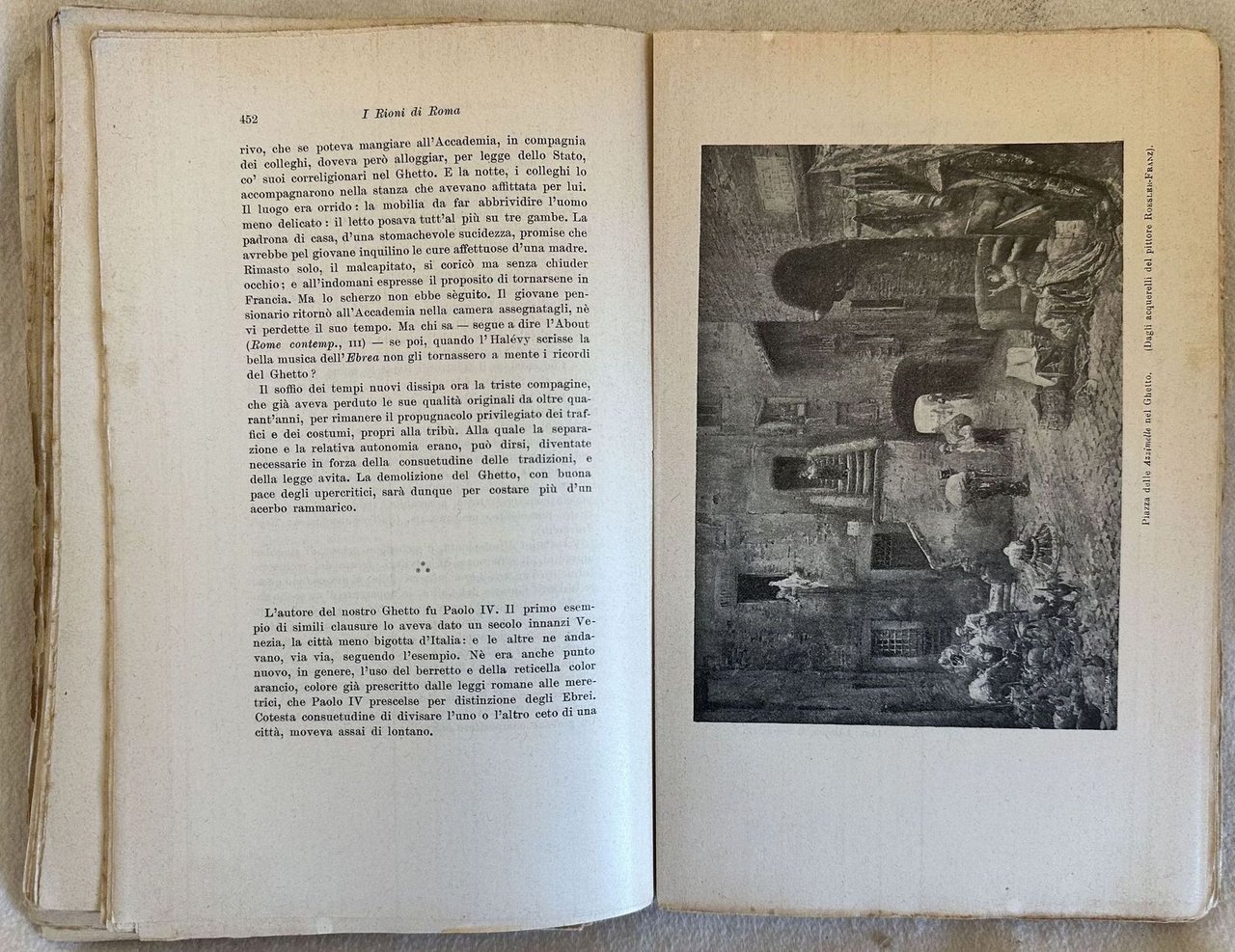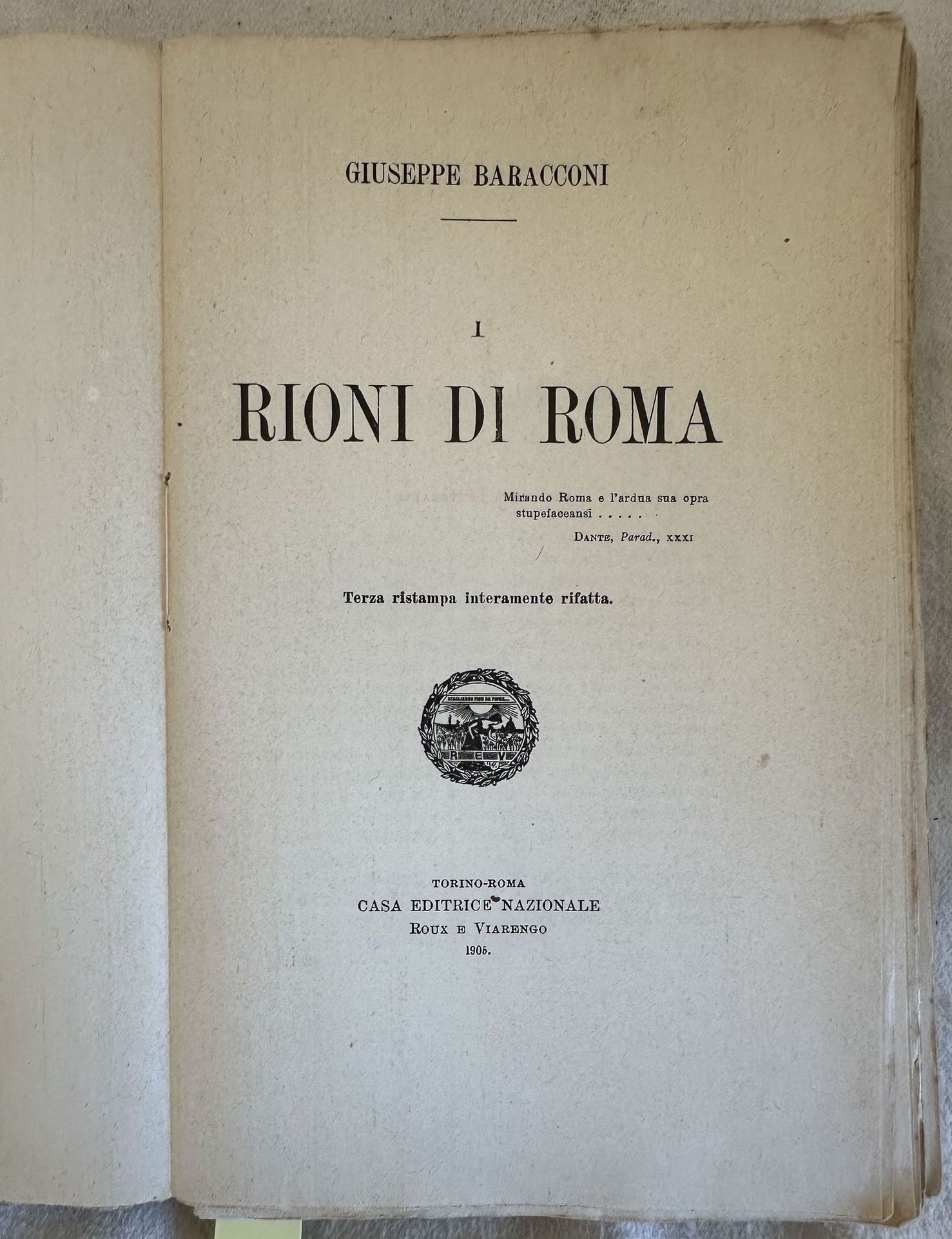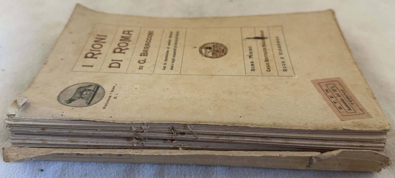 Edizione del 1905 di questa celebre monografia sui rioni di Roma scritta da Giuseppe Baracconi. L'opera venne pubblicata per la prima volta nel 1899 dopo la prima comparsa sul giornale "La Rassegna" e in articoli setitmanali. La vecchia tipica Roma sopravvive in questo libro, nei suoi pittoreschi scorci. Numerose tavole fotografiche e foto all'interno. In discrete condizioni. Copertina editoriale in mediocri condizioni con usure marginali e mancanze. Piatto anteriore staccato. Legatura quasi assente. Pagine in ottime condizioni generali con rare fioriture. In 8. Dim. 23x14 cm. Pp. 605.Edition of 1905 of this famous monography about the areas of Rome written by Giuseppe Baracconi. The work was published for the first time in 1899 after it appeared in the magazine "La Rassegna" and in weekly articles. The old typical Rome survived in this book. Different photographic plates and photoes inside. in fair conditions Editorial cover in poor conditions lightly worn in the extremities. Front plate is detached. Binding almost lacks. Inside pages are in very good conditions with occasional foxing. In 8. Dim. 23x14 cm. Pp. 605.<BR><BR>
