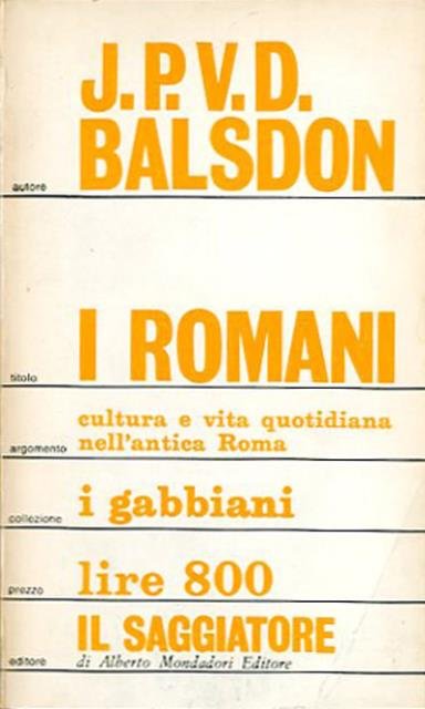 366 p. ; 18 x 11 cm. I Gabbiani. Nuova serie. Saggi di P.A. Brunt, M.L. Clarke, M.W. Frederiksen, Colin Hardie, A.H.M. Jones, F.H. Lawson, A.H. McDonald, I.A. Richmond, A.N. Sherwin-White sulla cultura e vita quotidiana nell'antica Roma. Titolo originale dell'opera: "The Romans". Traduzione di Gloria Ferrari. . Brossura editoriale, coperta in cartoncino flessibile plastificato, di colori b/n e giallo. Codice libreria 4120.