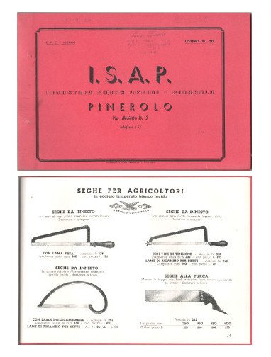 Catalogo illustrato (cm 25x17) copertina in cartoncino pag. 32 con decine di illustrazioni di ogni tipo di seghe con i relativi prezzi. Ottimo stato