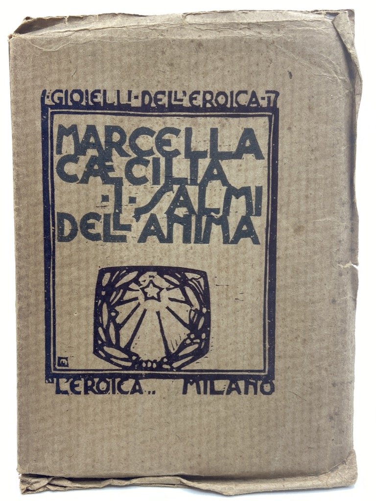 Brossura editoriale illustrata, cm 20 x 14, pp 67 (13), fregi, tavole, cornici del testo e titoli in arancio. I Gioielli dell’Eroica, numero 17. Buono stato, inevitabilmente un po’ sgualcita l’ampia unghiatura dei piatti della brossura. Edizione originale dell'opera prima, e unica pubblicata in volume, della poetessa Marcella Cecilia. Raccolta di 33 liriche precedute da una prefazione di Ettore Cozzani e decorate da fregi e 4 tavole xilografiche di Publio Morbiducci (Roma 1889-1963); in calce alcune pagine in cui Cozzani presenta la rivista L'Eroica e alcune collane e titoli pubblicati dall'omonima impresa editoriale.
