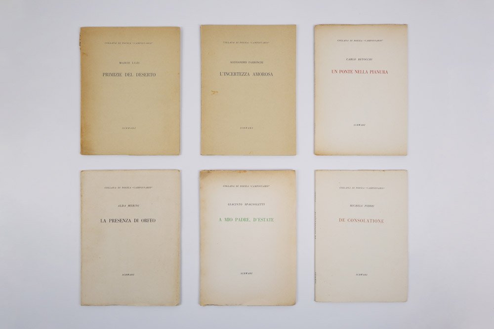 LIBROEdizioni originali nella rarissima emissione con cofanetto editoriale.Collezione in complessive più che buone condizioni (normali tracce d'usura perimetrale all'astuccio; Luzi nell’esemplare n. 104, brunito alla copertina e con mancanze a testa e piede, per il resto fresco e pulito; Parronchi nell’esemplare n. 953, in ottime condizioni, fresco e pulito [da segnalare due minime macchie alla copertina, non deturpanti]; Betocchi nell’esemplare n. 637 in ottime condizioni; Merini in una copia senza numero appartenente alla ristampa non dichiarata in bianco e nero [ancora a fogli chiusi, con minimi segni d’adesione in quarta di copertina]; Spagnoletti nell’esemplare n. 82, in ottime condizioni [appena bruniti i bordi delle pagine]; Pierri nell’esemplare n. 392, in ottime condizioni).Raccolta in cofanetto di sei dei primi sette volumi della collana «Campionario» (il terzo quaderno, «Un grido e paesaggi» di Ungaretti, dapprima annunciato con il titolo di «Monologhetto», uscì in formato più grande e non fu qui raccolto): «Primizie del deserto» di Mario Luzi (con un ritratto dell’autore di Ottone Rosai), «L’incertezza amorosa» di Alessandro Parronchi (ritratto da Mario Marcucci), «Un ponte nella pianura» di Carlo Betocchi (ritratto da Rolando Monti), «La presenza di Orfeo» di Alda Merini (ritratta da Giustino Vaglieri), «A mio padre, d’estate» di Giacinto Spagnoletti (ritratto da Luigi Bartolini) e «De Consolatione» di Michele Pierri (ritratto da Miriam Pierri). -- I volumi furono pubblicati tra il 1952 e il 1953, quando la libreria di Arturo Schwarz era ancora un punto di ritrovo di letterati e intellettuali e non ancora l’iconica galleria d’arte in cui si sarebbe trasformata nel 1961, crocevia dei più noti artisti avanguardisti del Novecento. Vengono qui pubblicate le raccolte d’esordio di Alda Merini e di Michele Pierri e la seconda raccolta di Giacinto Spagnoletti (direttore della collana, che ancora giovane si era già fatto un nome come curatore e critico), mentre gli altri poeti erano già molto affermati: come si deduce dai risvolti di copertina di «Primizie del deserto» e dell’«Incertezza amorosa», Schwarz aveva progetti molto ambiziosi per la sua collana, che prevedeva anche testi di Alfonso Gatto (il cui posto fu poi preso dalla «Presenza di Orfeo» di Alda Merini), Vittorio Sereni, Attilio Bertolucci, Giorgio Caproni «e altri». -- Il primo volume di «Campionario», «Primizie del deserto», apparve a novembre 1952; l'ultimo, «De Consolatione», apparve ad aprile 1953, con annuncio al risvolto di copertina di altri due volumi nella collana, «Sciarada» di Gatto (che non fu mai pubblicato) e «Ombre» di Bartolini (che fu pubblicato come «Ombre sulle metope», primo volume dell’altra collana poetica di Schwarz, «Dialoghi con il poeta»). -- I contatti tra l’editore e Spagnoletti erano iniziati quando Schwarz (nato nel 1924 ad Alessandria d’Egitto ed espulso come trotzkista) ancora non era arrivato a Milano nel 1949. Intenzionato a inaugurare una collana di poesia, fu Spagnoletti a suggerire per primi i nomi di Luzi e dell'allora diciottenne Merini. L’attività editoriale prese avvio nell’aprile 1952 e proseguì frenetica fino al 1959, pubblicando autori come André Breton, Benjamin Péret, Leo Trotsky, Raffaele Carrieri, Elio Pagliarani, Salvatore Quasimodo e Tristan Sauvage, pseudonimo sotto cui si celava lo stesso editore Schwarz.