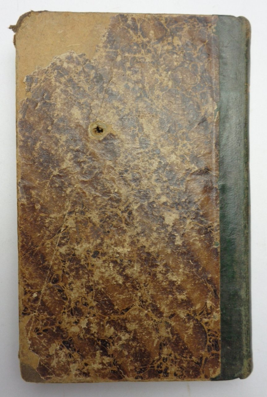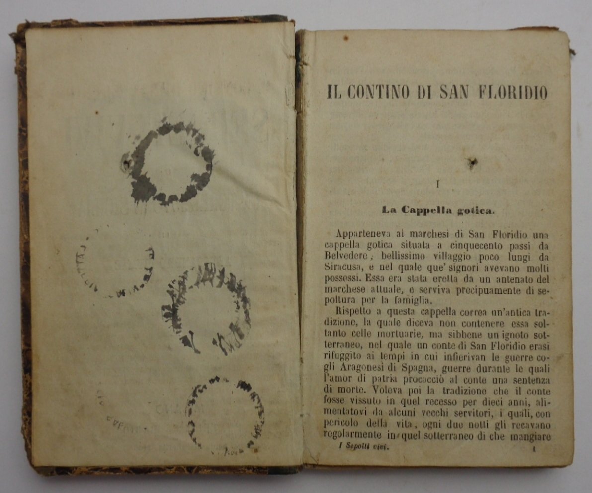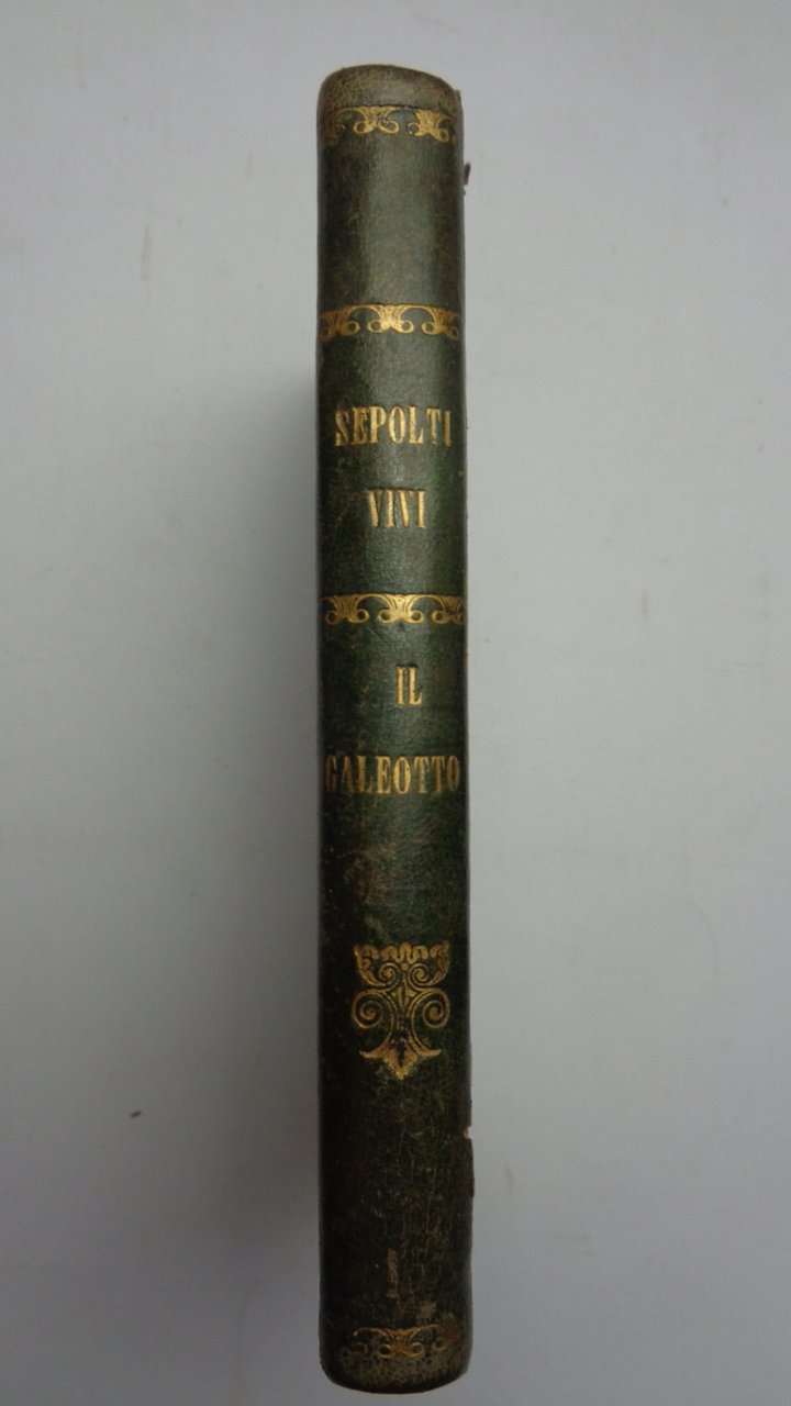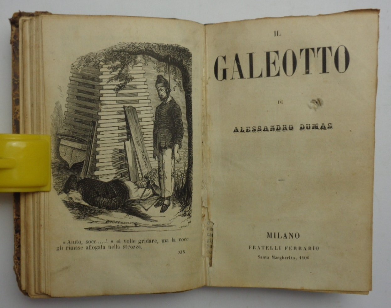 Un volumetto (15 cm) di 132 pagine. Legatura coeva in mezza pelle, titoli al dorso ornati e dorati. Piatti con carta marmorizzata con usure e strappi agli angoli. Tracce di timbri al retro della pagina di titolo; un foro (probabilmente di cacciavite) attraversa tutto il volume. A seguire, nello stesso volume: Alessandro Dumas, IL GALEOTTO (Milano, Ferrario, sd, 1859?) di 128 pp., mutilo degli ultimi due fogli. Antiporte illustrate. Modesto esemplare di questo romanzo, poi ripubblicato col titolo Il Contino di San Floridio, ambientato tra Messina e Siracusa ai tempi del devastante terremoto del 1783.