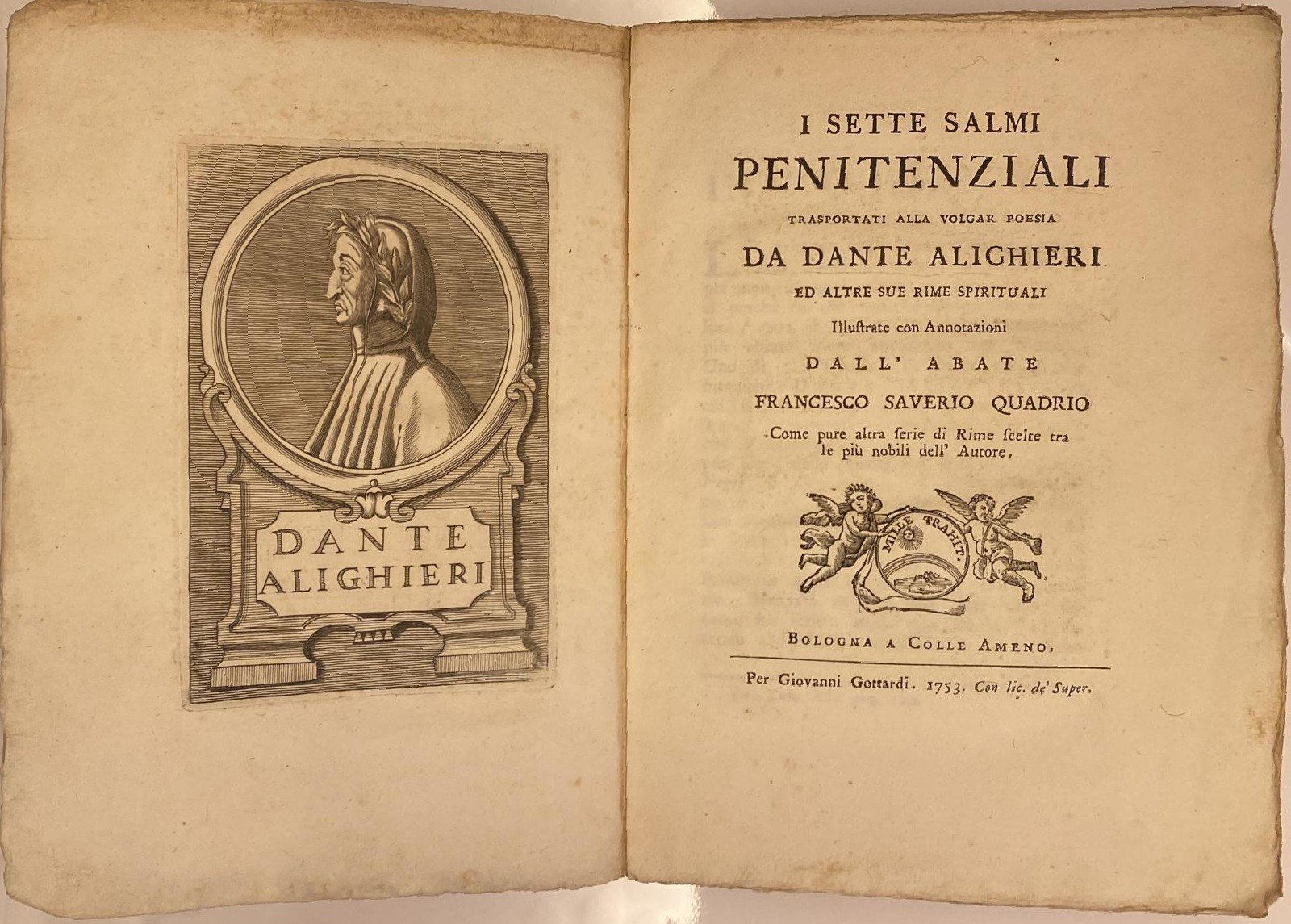 Alighieri Dante - I SETTE SALMI PENITENZIALI TRASPORTATI ALLA VOLGAR POESIA DA DANTE ALIGHIERI ed altre sue rime spirituali Illustrate con annotazioni dall'abate Francesco Saverio Quadrio. Bologna Colle Ameno, Giovanni Gottardi, 1753.