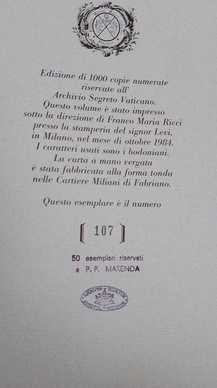 In 4', seta ed. con ill. col. appl. alpiatto , astuccio ed., pp. 279. con una nota storiaca di Mons. Martino Giusti, prefazione di Alessandro Pratesi, copia n. 107/1000 di 50 esemplari riservati a P.P. Marenda dell'Archio Segreto Vaticano, check control conservato.