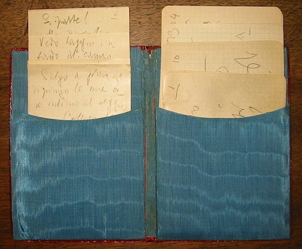 16mo (cm. 16,2), due taccuini: 13 foglietti di cm. 14,5x8,5 e 44 foglietti di cm. 13x10. Il tutto in facsimile d’autografo. Legatura editoriale in pelle rossa con cornici oro ai piatti. Tasche interne in seta azzurra che contengono i foglietti. Sui due piatti sono impresse in oro le due imprese: anteriore ‘Più alto e più oltre. Primo gruppo di squadriglie’; posteriore ‘Io ho quel che ho donato’. Titolo in oro al ds. Sul piatto anteriore, nella parte inferiore : ‘Istituto Nazionale per la edizione di tutte le opere di Gabriele D’Annunzio’. Il primo taccuino è il diario tenuto durante il volo sulle Bocche di Cattaro, il secondo raccoglie gli ordini impartiti dal comandante al pilota ed ai mitraglieri durante il volo dalla Puglia a Cattaro e ritorno, nell’ottobre 1917. Questa edizione fu donata ai benemeriti della tiratura della Edizione Nazionale su carta del Giappone in 209 esemplari. Tirata, presumibilmente come quest’ultima, in 209 esemplari. Ottimo esemplare. Molto raro. Vecchioni, 115a.