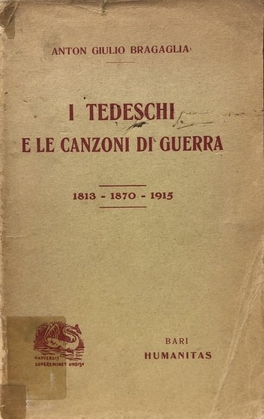 Prima edizione, 1915. Brossura, con nastro adesivo trasparente come residuo di fascetta di bibioteca privata. Dorso in buone condizioni, segni sulla copertina e minime mancanze ai margini e al dorso, pp 323. Saggio sulle canzoni popolari in lingua tedesca dall'antichitˆ aila prima guerra mondiale.
