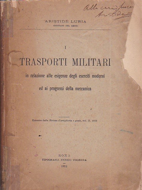 In-8°, pp. 159, brossura editoriale con invio autografo dell'autore. 4 tavv. ripiegate f.t. con 70 figg. raffiguranti mezzi di trasporto militari di ogni sorta. Mancanze marginali al piatto anteriore, dorso restaurato, piatto posteriore rifatto. Copia da studio. L'autore era Capitano del Genio.