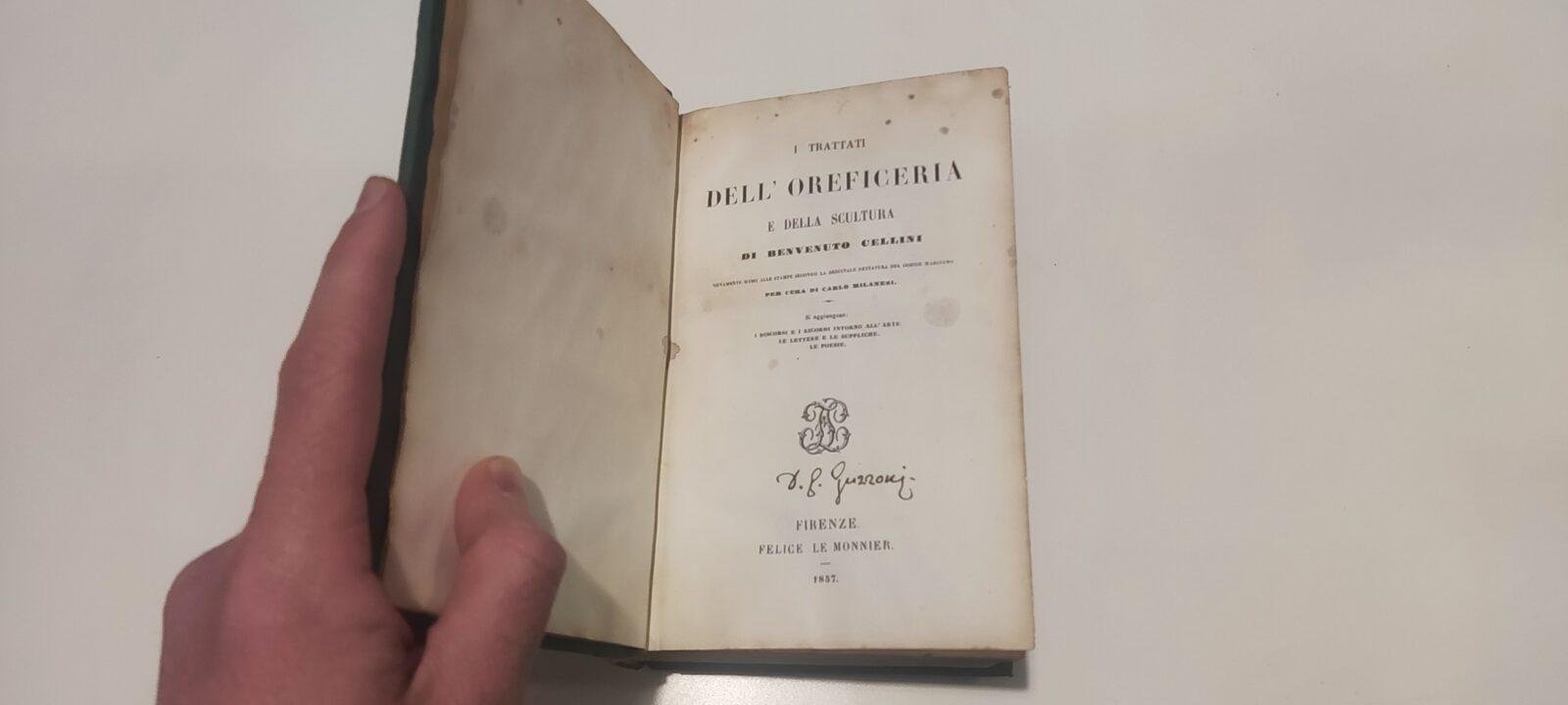 Benvenuto Cellini - I trattati dell'oreficeria e della scultura Le Monnier 1857 Edizione in mezzapelle con fregi dorati. Libro in ottime condizioni, minimi segni del tempo: leggere abrasioni al dorso e soprattutto ai piatti con tracce di polvere, rare e leggere fioriture. Non esitate a contattarci per altre foto o richieste. Saremo lieti di soddisfare ogni vostra esigenza.