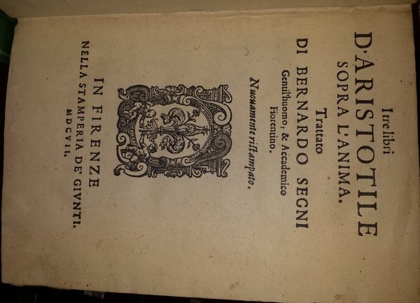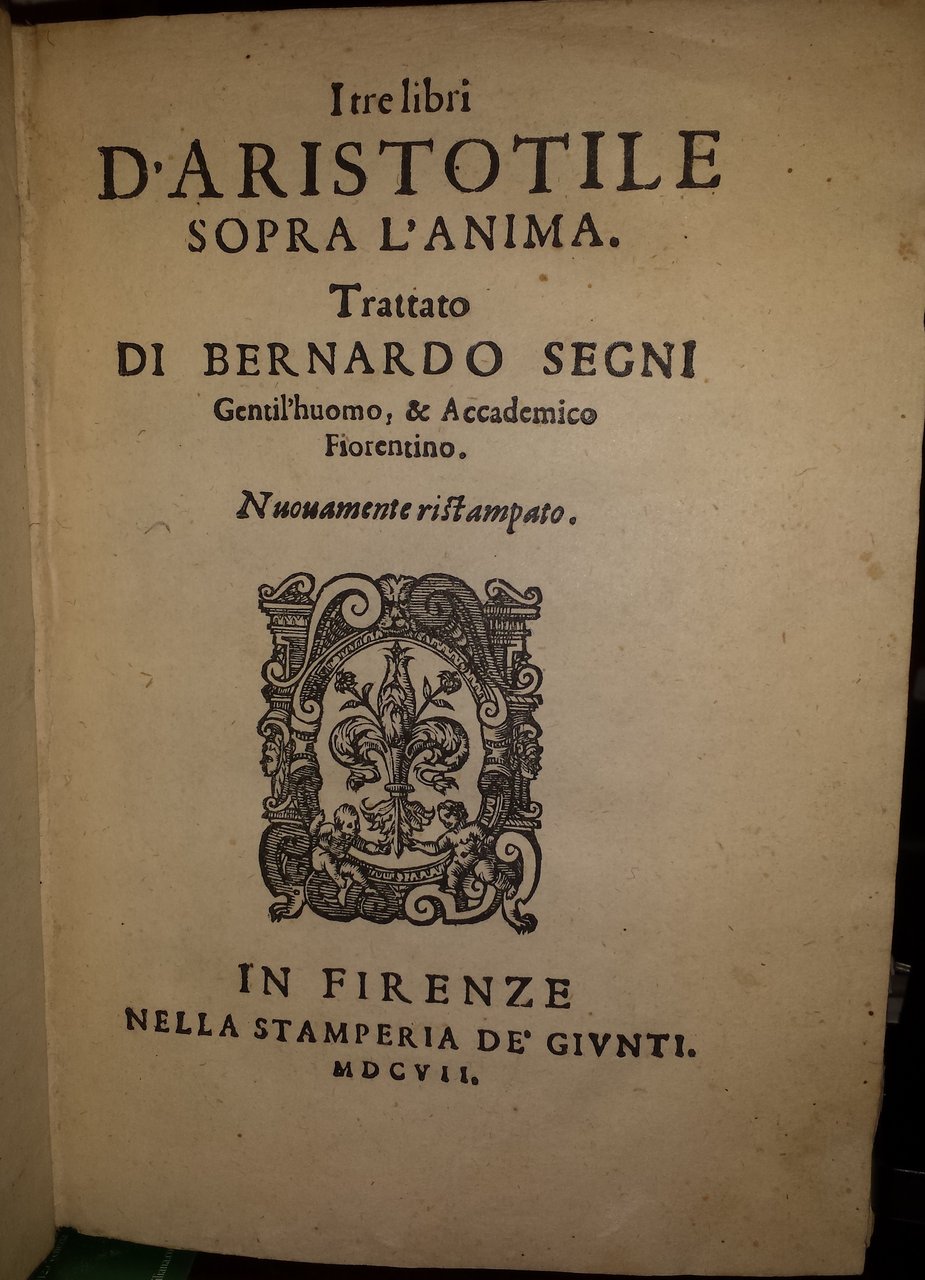 I tre libri d'Aristotile sopra l'anima. Trattato di Bernardo Segni gentil'huomo, & accademico fiorentino. Nuovamente ristampato.