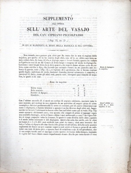 Rarissima prima edizione a stampa dell'importante trattato. Antiporta inciso, con 39 tavole incise (due numerate come 30a e 30b) per un totale di 105 figure di piatti, decori, strumenti per fabbricazione ecc. Con il supplemento uscito l'anno successivo riguardante la maiolica. Testo e tavole con legatura cartone blu coevo, piccoli aloni di umidita' al bordo di alcune pagine che non pregiudicano la lettura o lo stato di conservazione dell'opera