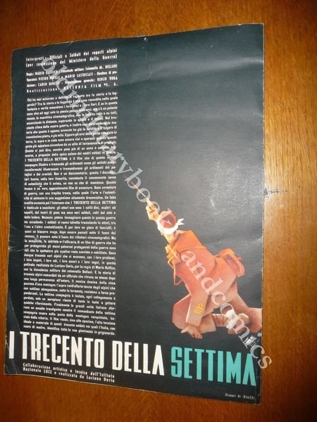 DESCRIZIONE: Brochure per il film realizzato da Nettunia ed interpretato dai soldati dei reparti alpini. Cm 23,4x31,2 pp.4 aucopertinate a colori con una doppia tavola illustrata e al retro la descrizione e i dati del film. I trecento della Settima è un film bellico diretto dal regista Mario Baffico ed interpretato da soldati italiani appartenenti alla Divisione Alpina “Cuneense”, reduci dal fronte albanese della guerra italo - greca. Ispirato ad un episodio realmente accaduto, fu girato nei mesi estivi del 1942, ma è poi uscito sugli schermi nel maggio 1943. CONDIZIONI: Ottime. PESO / WEIGHT: 22 gr. without package