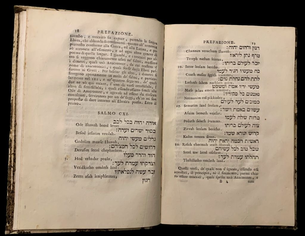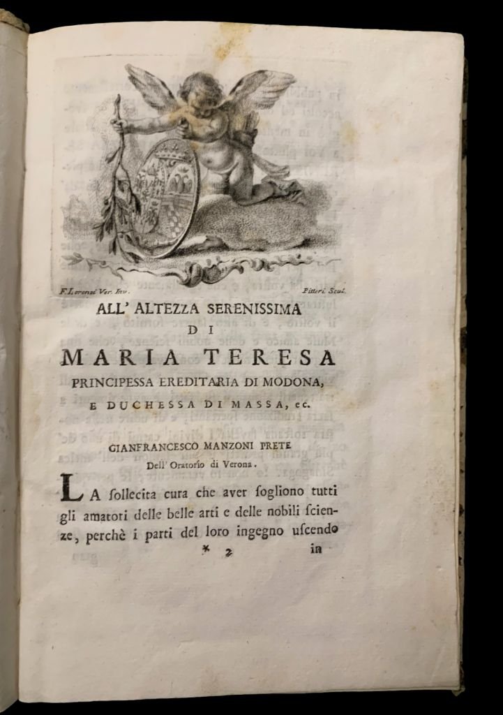 In 4°; (8), 179, (1) pp. Legatura coeva i n pieno cartoncino foderato con carta coeva color caffè. Un'integrazione di carta color caffé al dorso. Nota di possesso alla prima carta che identifica l'esemplare come appartenuto al noto critico d'arte, docente a Pavia e direttore delle Gallerie Estensi di Modena Giulio Bariola, del quale Federico Zeri scrisse: Gli uomini intelligenti si dividono in due categorie: quelli che parlano e scrivono, e quelli che parlano soltanto. [ ] Di ingegni parlanti e poco o nulla scriventi ne ho conosciuto uno, Giulio Bariola. Oltre agli incarichi istituzionali, Giulio Bariola, fu anche, figura di primo piano del panorama culturale italiano e Socio corrispondente della R. Deputazione di storia patria per le province modenesi (1928-29), Membro effettivo della R. Accademia di scienze, lettere ed arti di Modena (1928-29), Socio effettivo della R. Accademia di scienze, lettere ed arti di Modena (1931-32), Socio corrispondente dela R. Deputazione di storia patria per le province emiliane (1932-33). Alcune note bibliografiche dello stesso Bariola al recto del piatto anteriore. Altra nota di possesso settecentesca privata Fratelli Setti, al piatto anteriore. Esemplare in buone-ottime condizioni di conservazione. Tre bellissime incisioni di Valeri e Pitteri. Dedicatoria all'altezza Serenissima di Maria Teresa Principessa Ereditaria di Modena, e Duchessa di Massa. ec. Prima ed unica edizione di questa traduzione dall'ebraico dei Treni di Geremia ad opera dell'ecclesiastico Francesco Giovanni Manzoni (1727-1762). Opera in parte in lingua ebraica. Il Libro di Rut è un antico testo biblico che racconta la storia di Rut, una donna moabita, e della sua fedeltà verso sua suocera, Noemi. Ambientato durante il periodo dei Giudici, questo breve libro della Bibbia affronta temi di lealtà familiare, redenzione e provvidenza divina. Rut, vedova senza figli, decide di seguire Noemi nella terra di Israele, dimostrando un amore e un impegno straordinari. La trama si sviluppa attraverso l'amicizia tra Rut e un uomo di nome Boaz, che diventa il loro redentore. La storia culmina con il matrimonio tra Rut e Boaz, sottolineando l'importanza della fede e dell'obbedienza nei piani divini. Pur essendo uno dei libri più brevi della Bibbia, il Libro di Rut offre preziose lezioni di resilienza e speranza. Non comune. Rif. Bibl.: IT\ICCU\VIAE\007503.