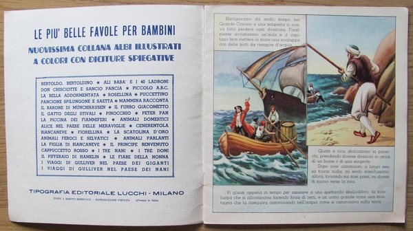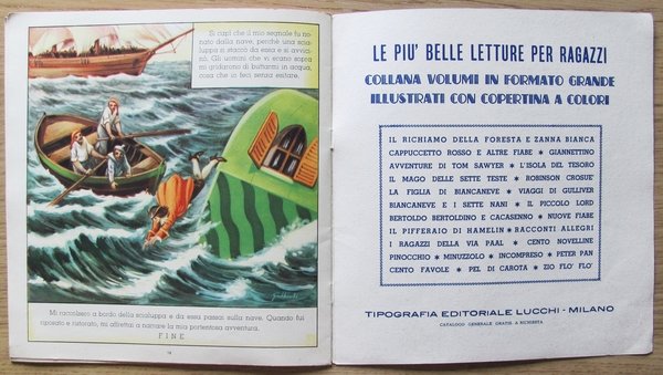 Collana "Le più belle favole per bambini". Belle illustrazioni a colori a tutte le pagine di Galbiati. Editrice Lucchi - Milano, s.d. anni '60. Brossura editoriale con lievissime spellature al dorso. 24,5x26; pp.12. Ottimo stato. , Buono (Good)