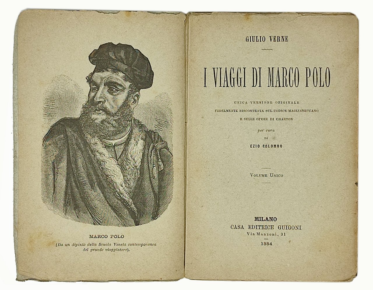 G. VERNE 'I VIAGGI DI MARCO POLO' unica versione originale fedelmente riscontrata sul codice magliabeccano e sulle opere di Charton per cura di EZIO COLOMBO. Volume Unico. Milano, Casa Editrice Guigoni. 108 pagine. Dimensioni: in-32 (10,5 x 16 cm circa).; Stato di conservazione: qualche leggero ingiallimento, una piccola e marginale mancanza (sul brodo bianco superiore) di pagina 5-6, una piccola mancanza sull'angolo superiore dei 2 fogli che contengono le 4 pagine 51-54 (mancanza che coinvolge una parte dell'indicazione del numero della pagina ma non riguarda il testo), una piccola rottura (quasi insignificante) su pagina 73-74 (si veda la foto numero), tagli sul dorso ma, nel complesso, un esemplare abbastanza ben conservato. Oltre al ritratto di Marco Polo in anteporta, è presente, nel testo, una tavola illustrata a piena pagina in nero. Edizione di difficilissimo reperimento in commercio di un classico (per altro poco noto) di Verne. Da collezione.