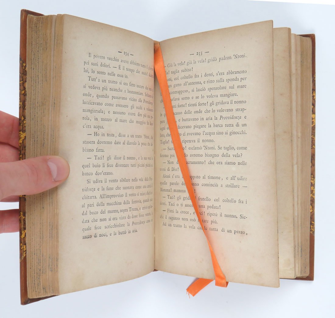 LIBROEdizione originale.Manca la prima carta; presenza di foxing alle carte.Il capolavoro dell’autore, primo della trilogia dei «Vinti» e romanzo simbolo del verismo. «Usciti da Treves nello stesso anno di “Malombra” di Antonio Fogazzaro, i “Malavoglia” passarono quasi inosservati. Fu grazie all’interessamento dell’amico Luigi Capuana, che ne scrisse una recensione sul “Fanfulla della Domenica”, e grazie alla mediazione in Francia del traduttore di Nedda, Émile Rod, che intuì subito l’alto valore del romanzo, che l’opera di Verga cominciò a venir apprezzata, fungendo da trampolino di lancio per i suoi successivi romanzi, tutti di notevole successo» (Cfr Govi, «I classici che hanno fatto l'Italia», 2010).Bibl.: Raya, Bibliografia verghiana, n. 236.