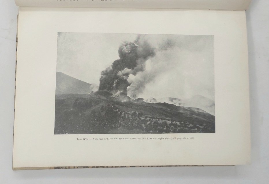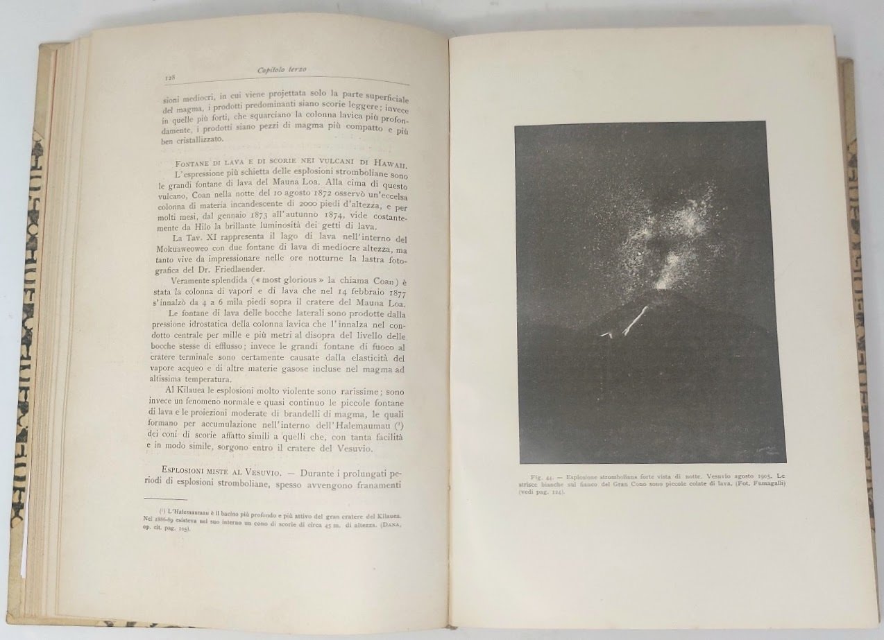 >in-8 grande(232x150 mm), pp. viii, 421 (compreso l'occhietto), (1). Titolo in rosso e nero, illustrato da 31 tavole (tre a doppia pagina) e numerose illustrazioni nel testo. Legatura in m. pergamena ed angoli, piatti in carta decorata, titolo in oro su tassello al dorso, brossure editoriali conservate. Prima edizione di uno dei più completi studi di vulcanologia, con una dettagliata rassegna dei vulcani attivi, accompagnata da dati sulle loro eruzioni storiche. L'Autore fu geologo, sismologo e vulcanologo, ideatore della scala Mercalli che misura l'intensità macrosismica di un terremoto attraverso l'osservazione dei danni e delle modificazioni ambientali prodotte da esso. Opera con belle fotografie di vulcani, anche in attività. Esemplare perfettamente conservato, in bella legatura.