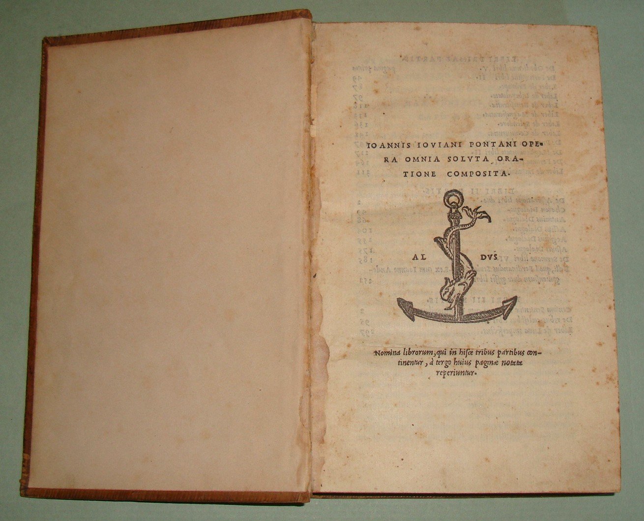 In fine: Venetiis, in aedibus Aldi, et Andrea Soceri, 1518-1519. Tre volumi in 8vo; cc. 4 n.nn., 327 erroneamente numerate 326; 318; 301, 19 n.nn. Al secondo volume mancano, perché soppresse dai censori dell'Inquisizione, le carte 48 (bianca), 65, 66 e 67 la fine cioè del "Dialogo di Charron". Ancora aldina al primo ed al terzo volume. Legatura inglese del secolo XVIII in bazzana, piatti inquadrati da fregi in oro, dorsi a cordoni con titoli e fregi dorati. Ex libris. Opera rara. Renouard, 87.6; S.T.C., pag. 533; Adams P, 1860; Caillet, 8828; Riccardi I, 303. Il terzo volume di poesie è dedicato all'astrologia, Tolomeo, le stelle e la la luna.