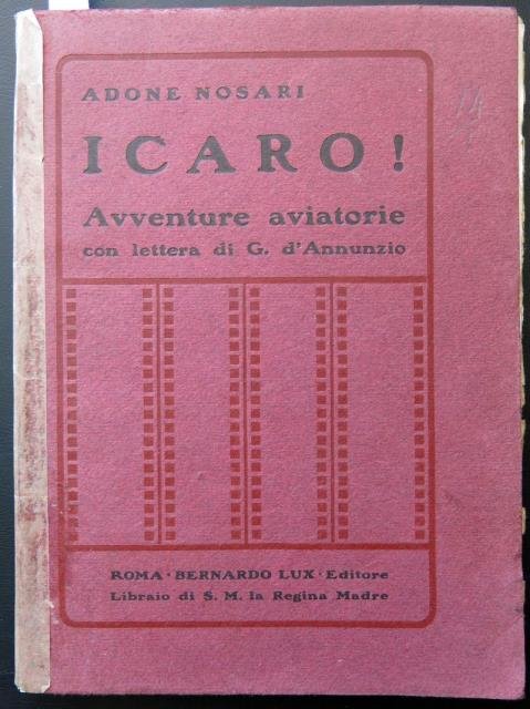 Bernardo Lux Editore Libraio di S. M. la Regina Madre, Roma, 1913. In 8vo piccolo quadrotto, ritratto fot. dell'A.in antip., pp. 62 + 1 (Indice), bross. orig. in carta bordeau, bei margini irregolari. Adone Nosari. (Tabellano di Suzzara 1875 - ?), giornalista e scrittore, fu inviato speciale e seguì la prima trasvolata atlantica di Italo Balbo. Raro. Dorso rinforzato ma buona conservazione.