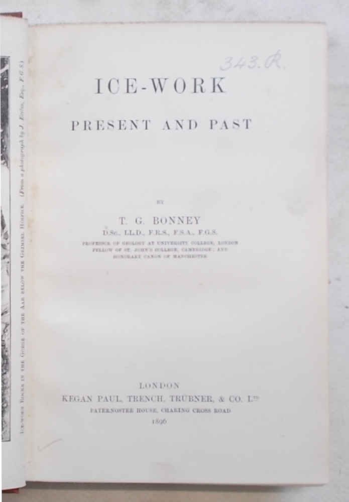 In 16° grande (cm. 19,5 x 13,5); pagg. XIV, 295; con 4 carte ripieg. (1 a colori) f.t., 1 tavola f.t. e 20 incisioni n.t.; tela origin. rossa con titoli e fegi in oro e in nero; etichetta e timbro ex library, ma ottimo. VG. ** Prima edizione. Contiene: existing evidence; traces of the glacial epoch; theoretical questions. Il reverendo Bonney, geologo, fu presidente dell'Alpine Club dal 1881 all'83 e della Geological Society dal 1884 al 1886. Volume della collana "International Scientific Series".