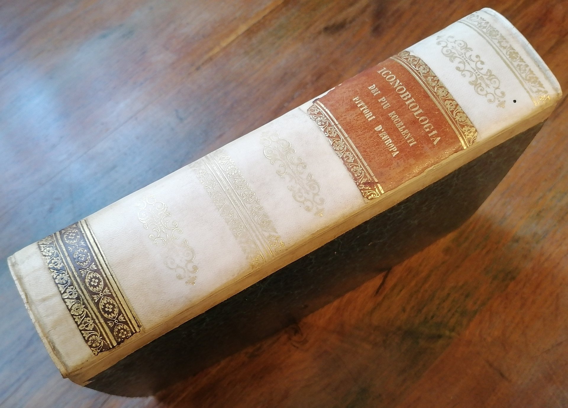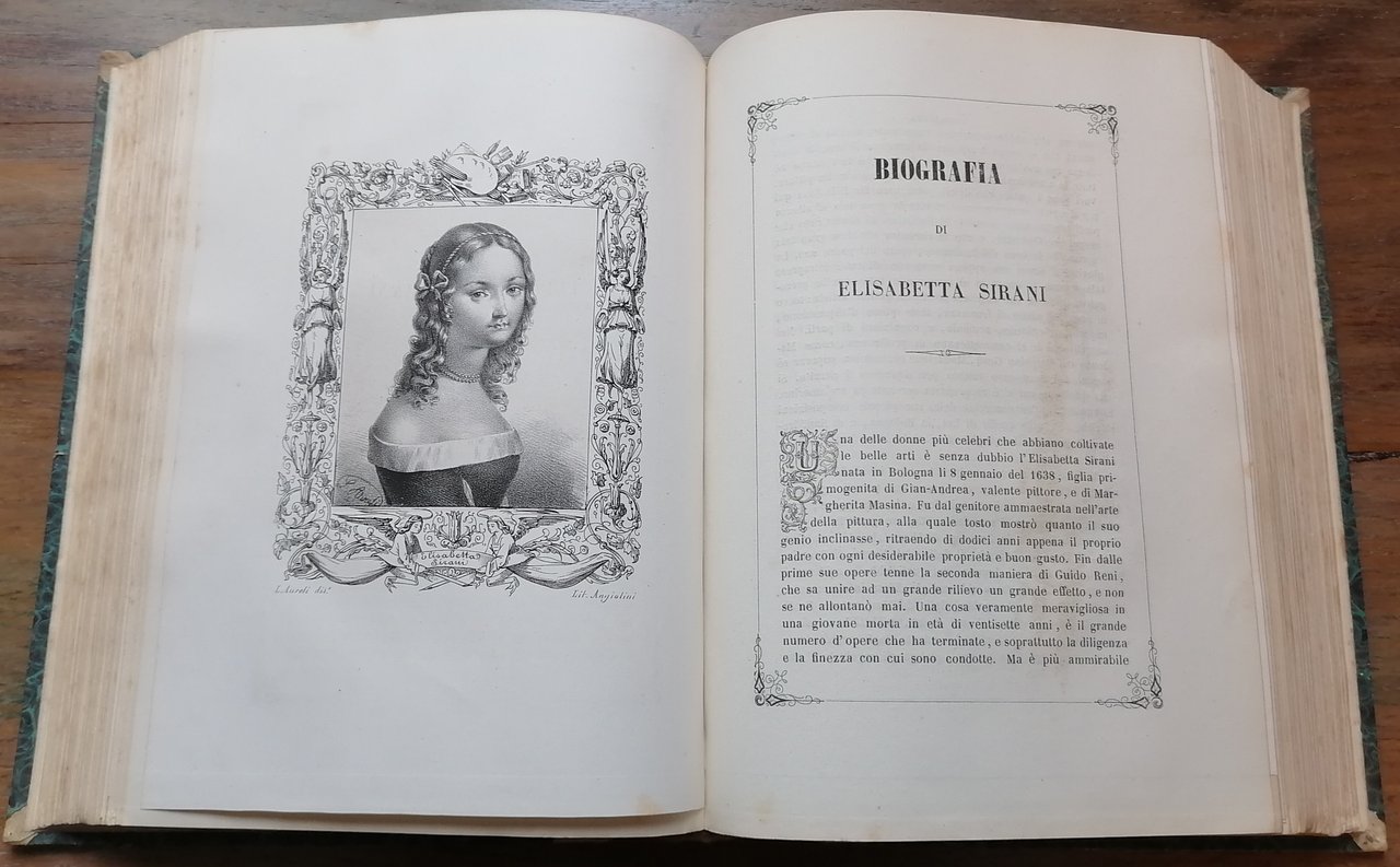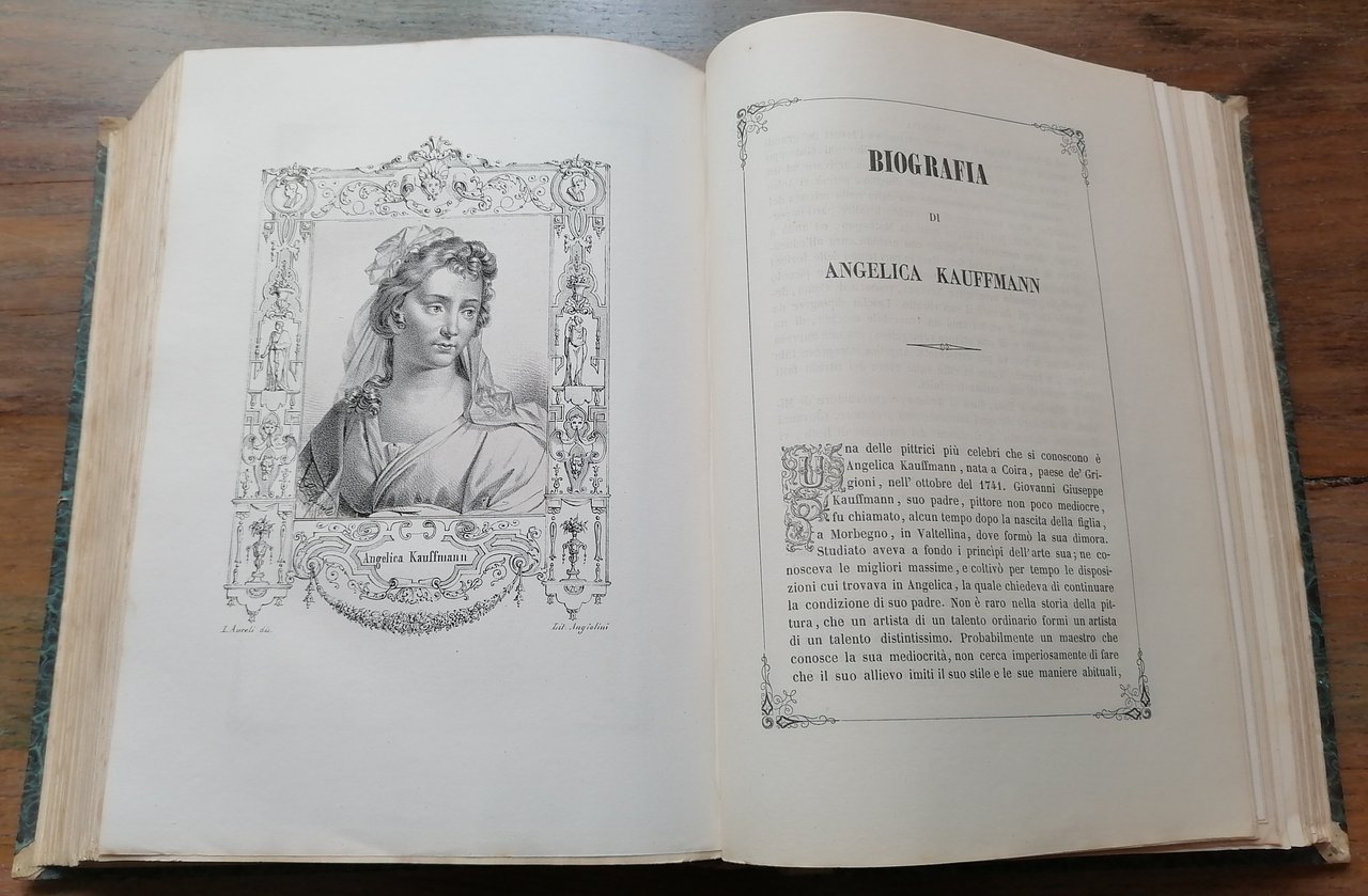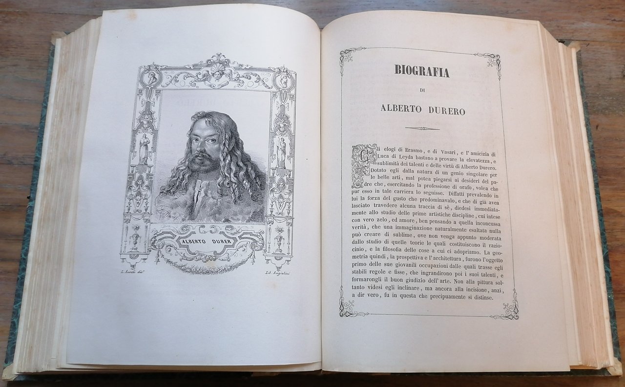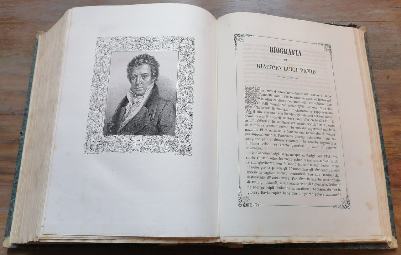 (Ritratti di pittori europei; Repertori biografici; Arte) Tre volumi in un solo tomo in 8° grande (cm 27 x 20), legatura coeva in mezza pergamena, al dorso impressioni dorate e tassello in pelle con titoli in oro, carta marmorizzata monocroma ai piatti, pp. complessive 874 non numerate, un frontespizio per l'intera opera con vignetta e data 1846, 3 frontespizi relativi alle singole scuole con data 1852, testo inquadrato entro cornice, 140 tavole fuori testo con i ritratti litografici dei pittori al verso. Ottimo stato di conservazione.
