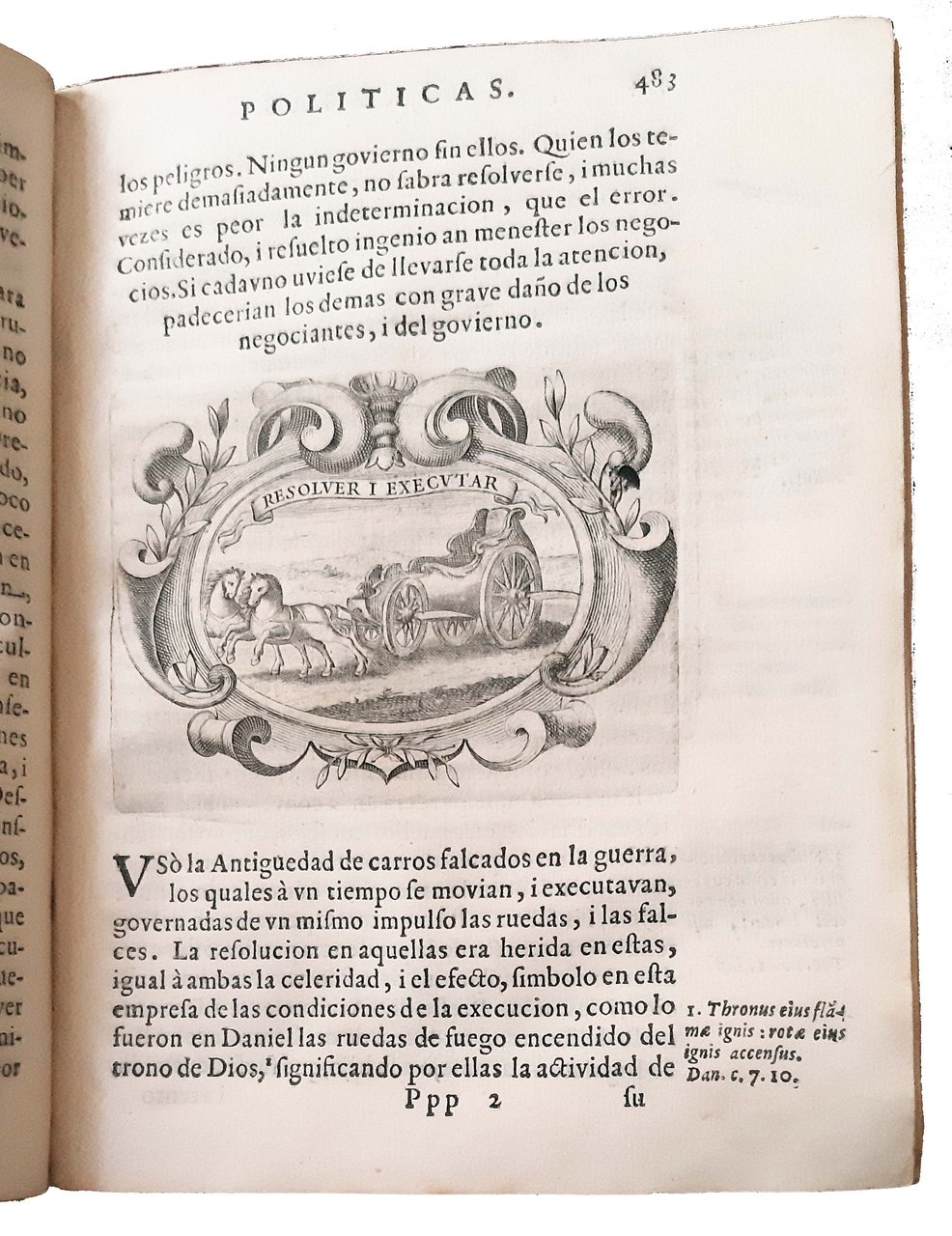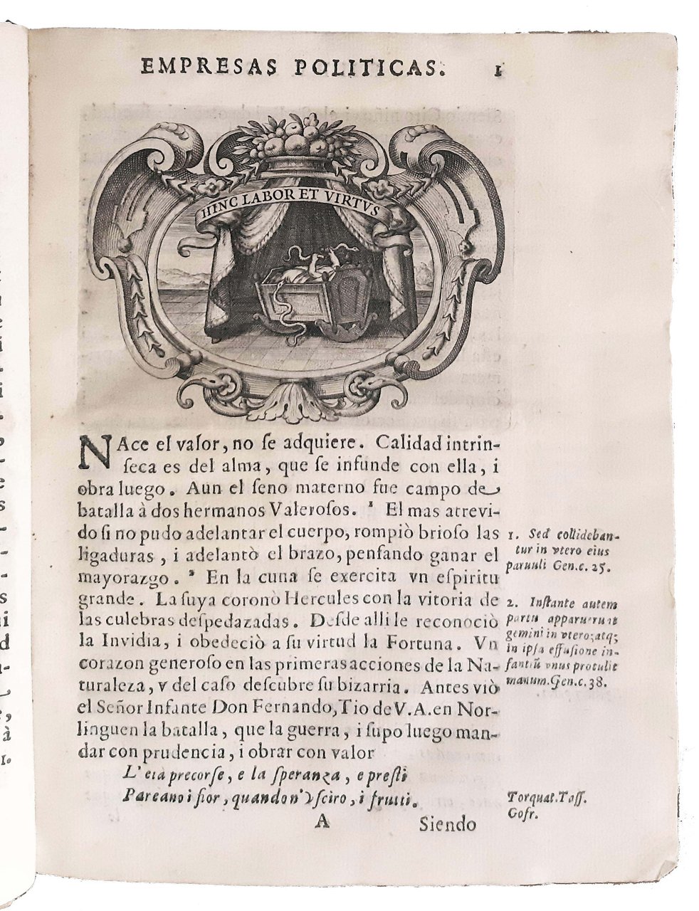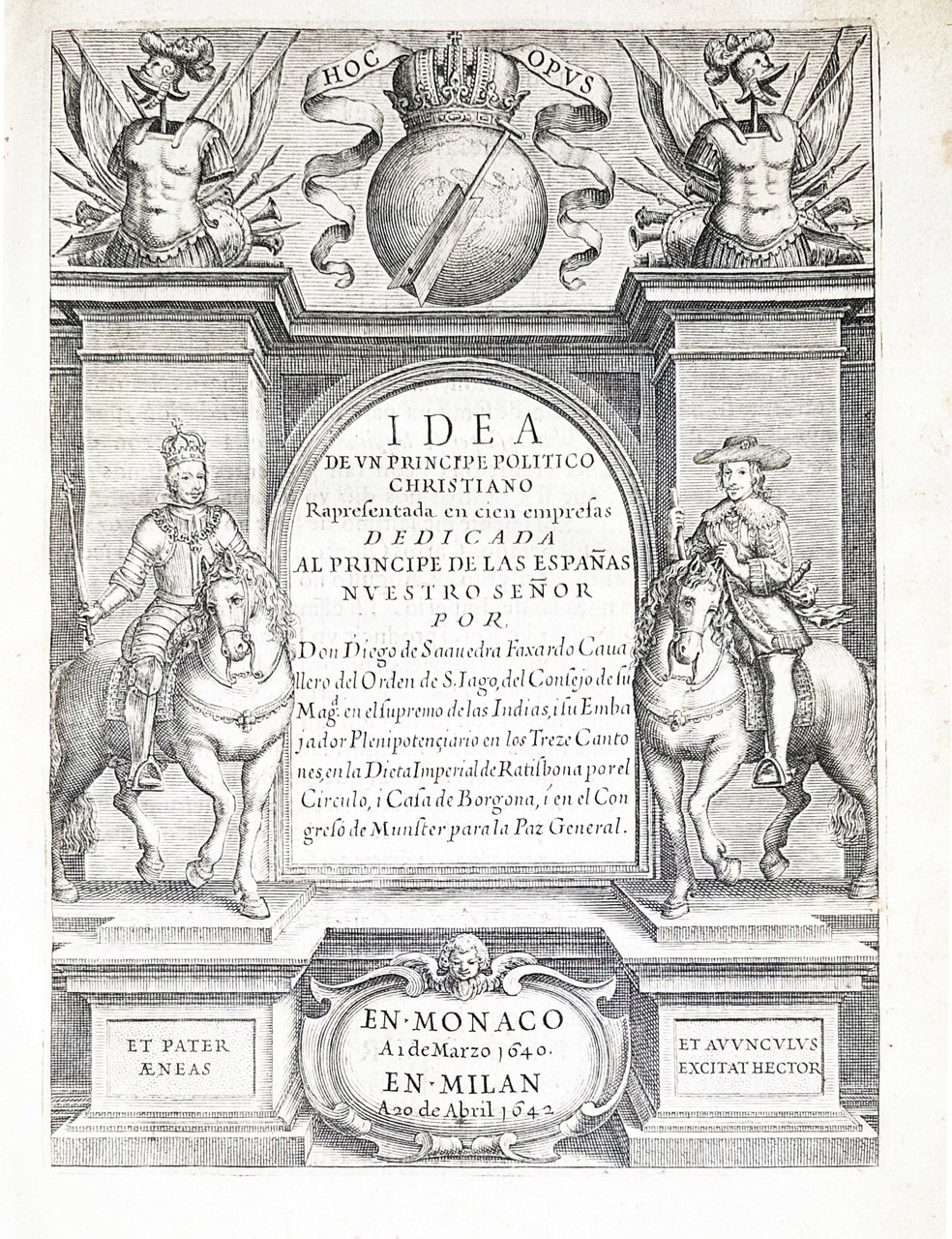 Idea de un principe politico christiano. Representada en cien empresas. Dedicada al principe de las Espanas nuestro senor por Don Diego Saavedra Fajardo del consejo de su Magestad en el supremo de las Indias, i su embasador extraordinario en Mantua i esguizaros i residente en Alemania.
