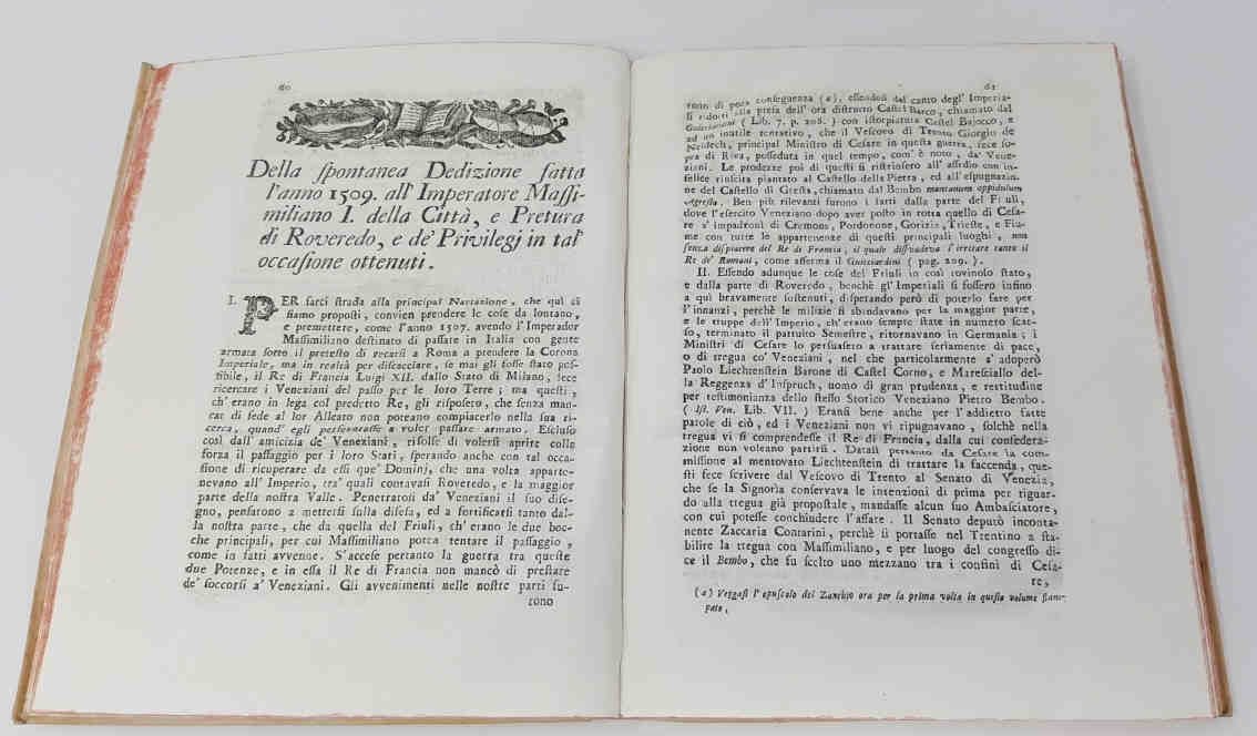 >in-4 (265x200 mm), pp. VIII, 295,1. Con un albero genealogico ripiegato. Buona legatura coeva in piena pergamena, titolo manoscritto al dorso. Il volume è corredato dai documenti dei quali si è fatto uso nell' opera. Prima edizione di quest' opera sulla valle trentina e l'area geografica di Rovereto, che comprende, per la prima volta, il lavoro di Francesco Terenzio Zanchi sulla guerra tra Massimiliano I e Venezia. Esemplare freschissimo.