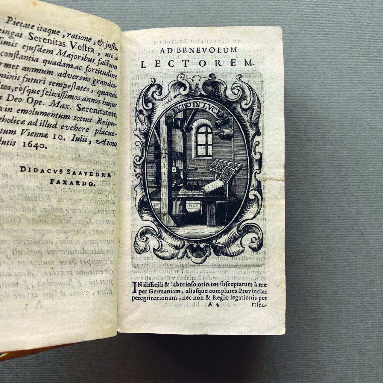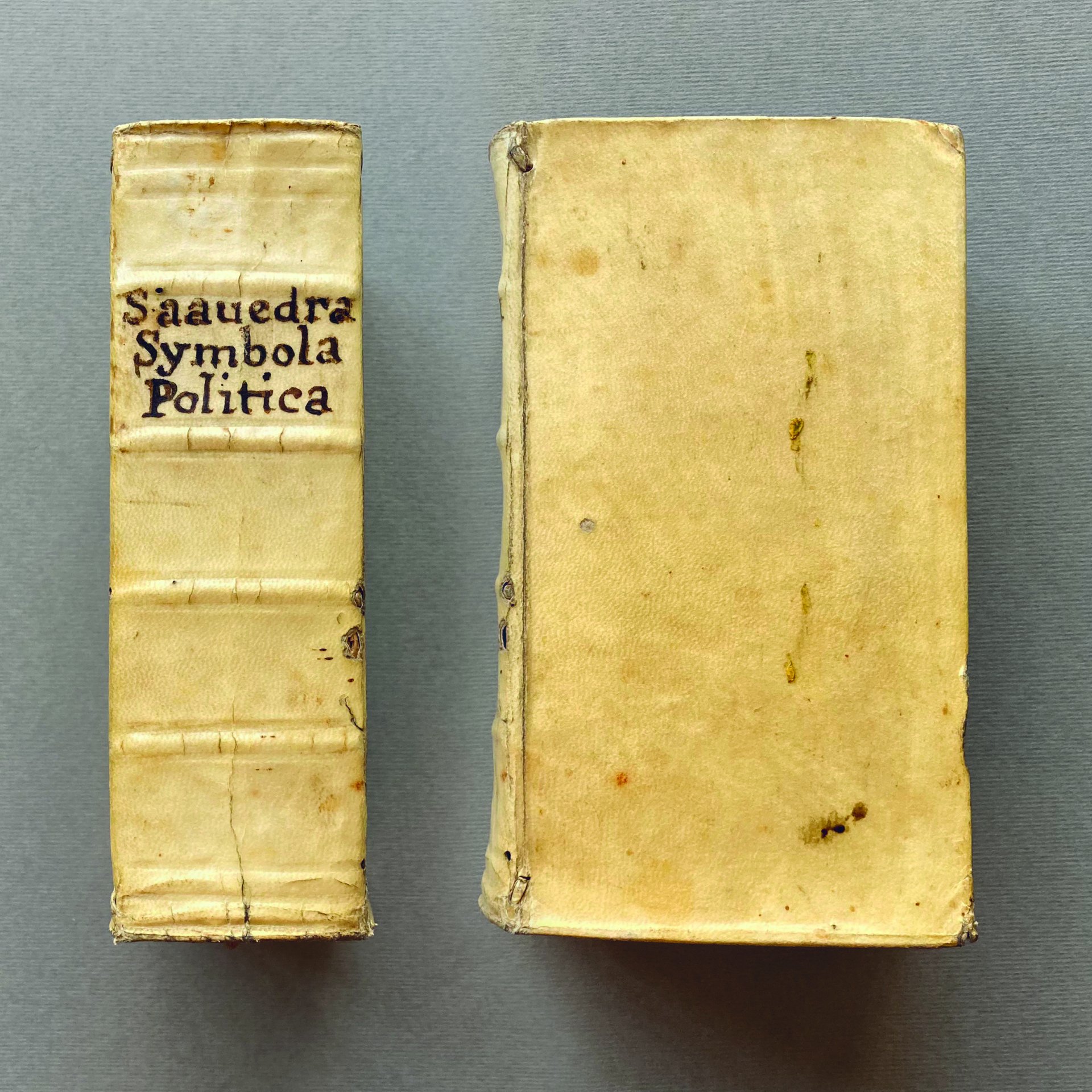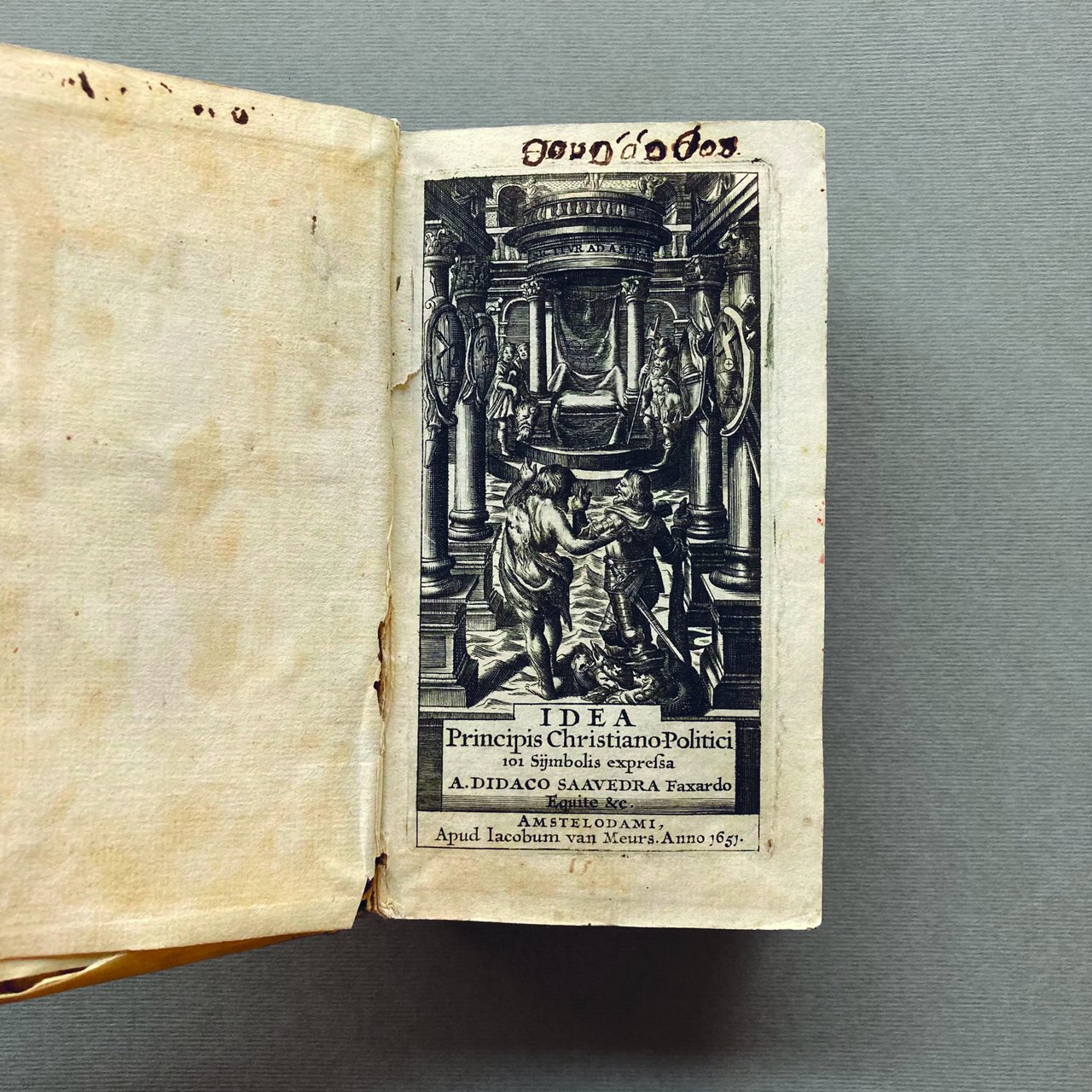 12° cm 13, pp. (24), 831, (9), con 103 emblemi finemente incisi al bulino e un frontespizio allegorico. Bell'esemplare nitidamente impresso, in rilegatura coeva di piena pergamena semi-rigida, con titolo manoscritto al dorso, parziale distacco dell'indorsatura. Libro di emblemi per il principe cattolico e antimachiavellico. Bibliografia: Landwehr 515; Praz 483, Seventeenth Century Imagery.